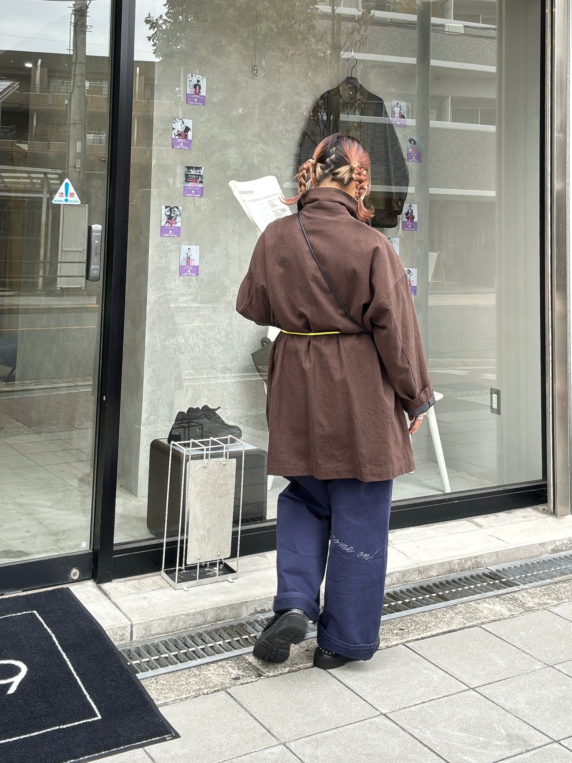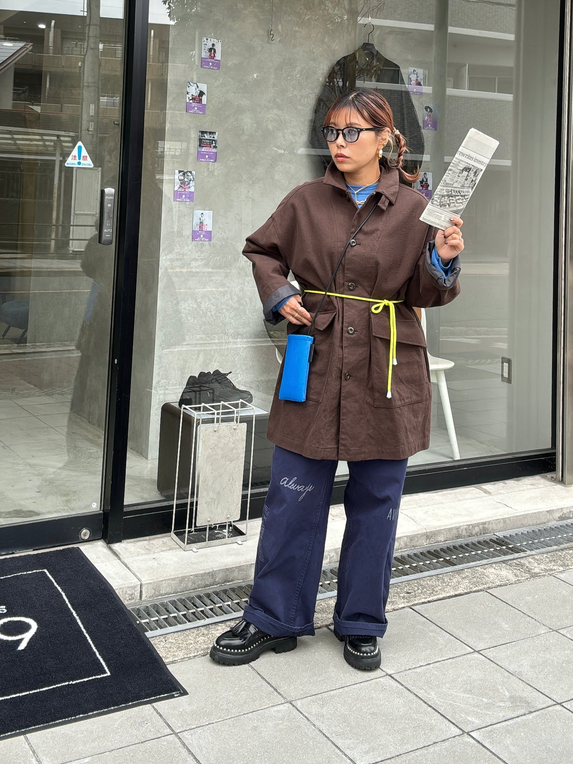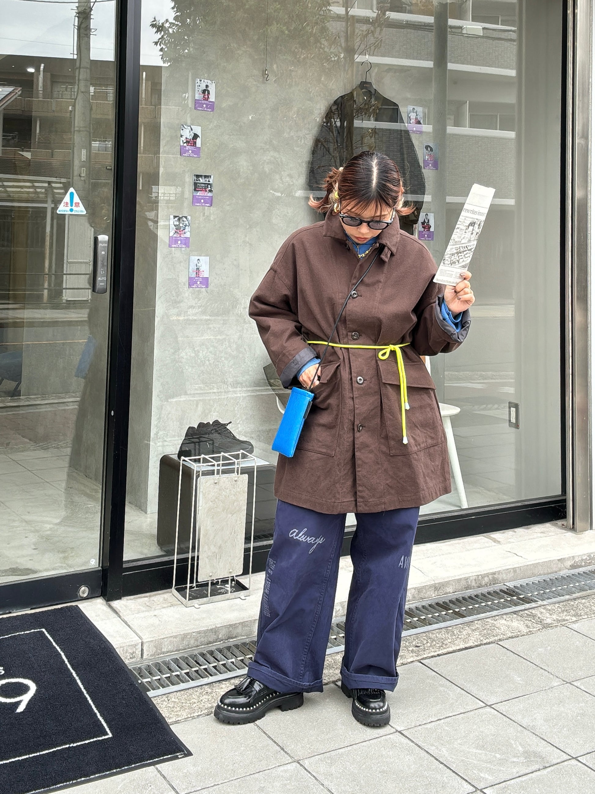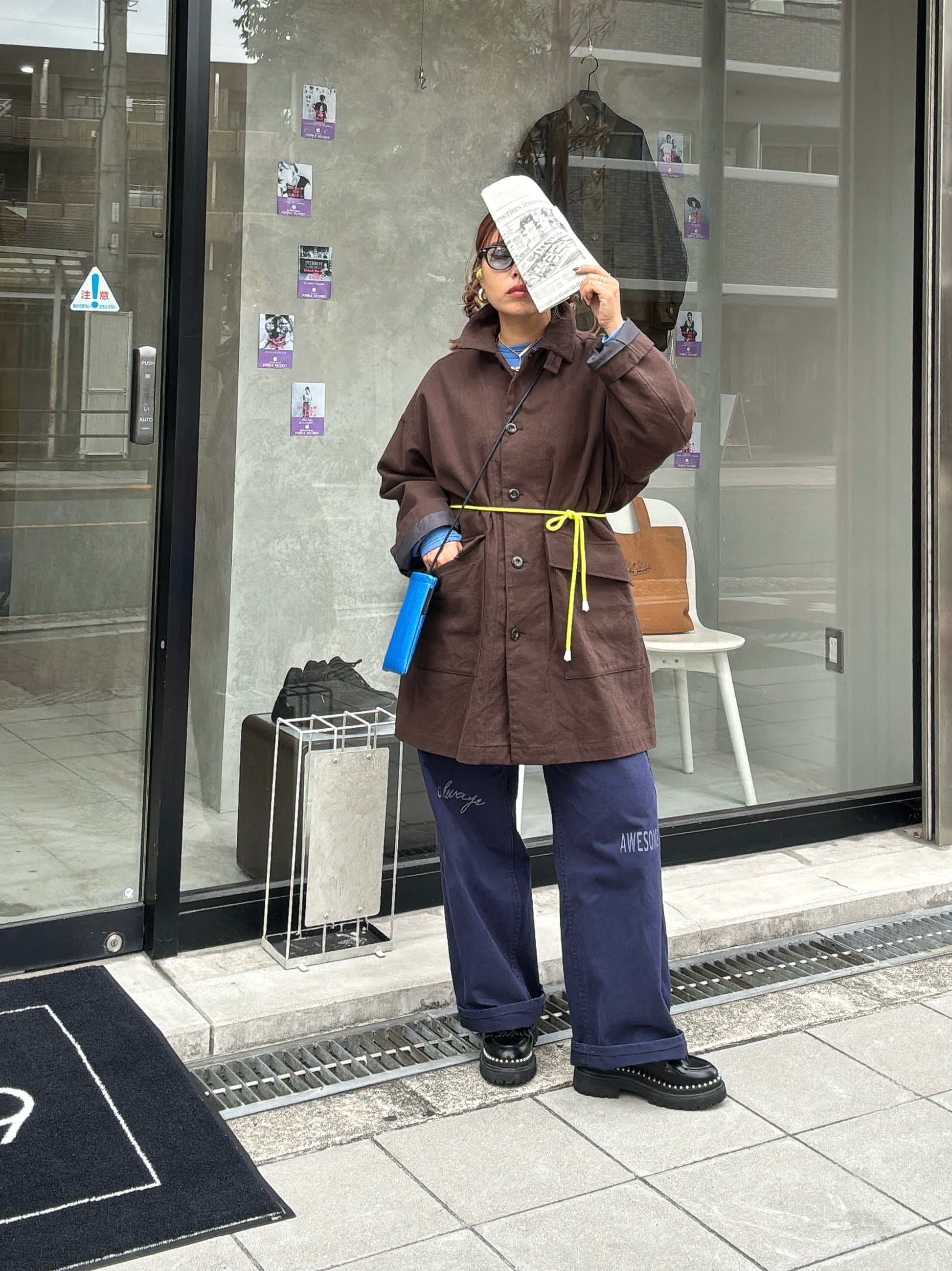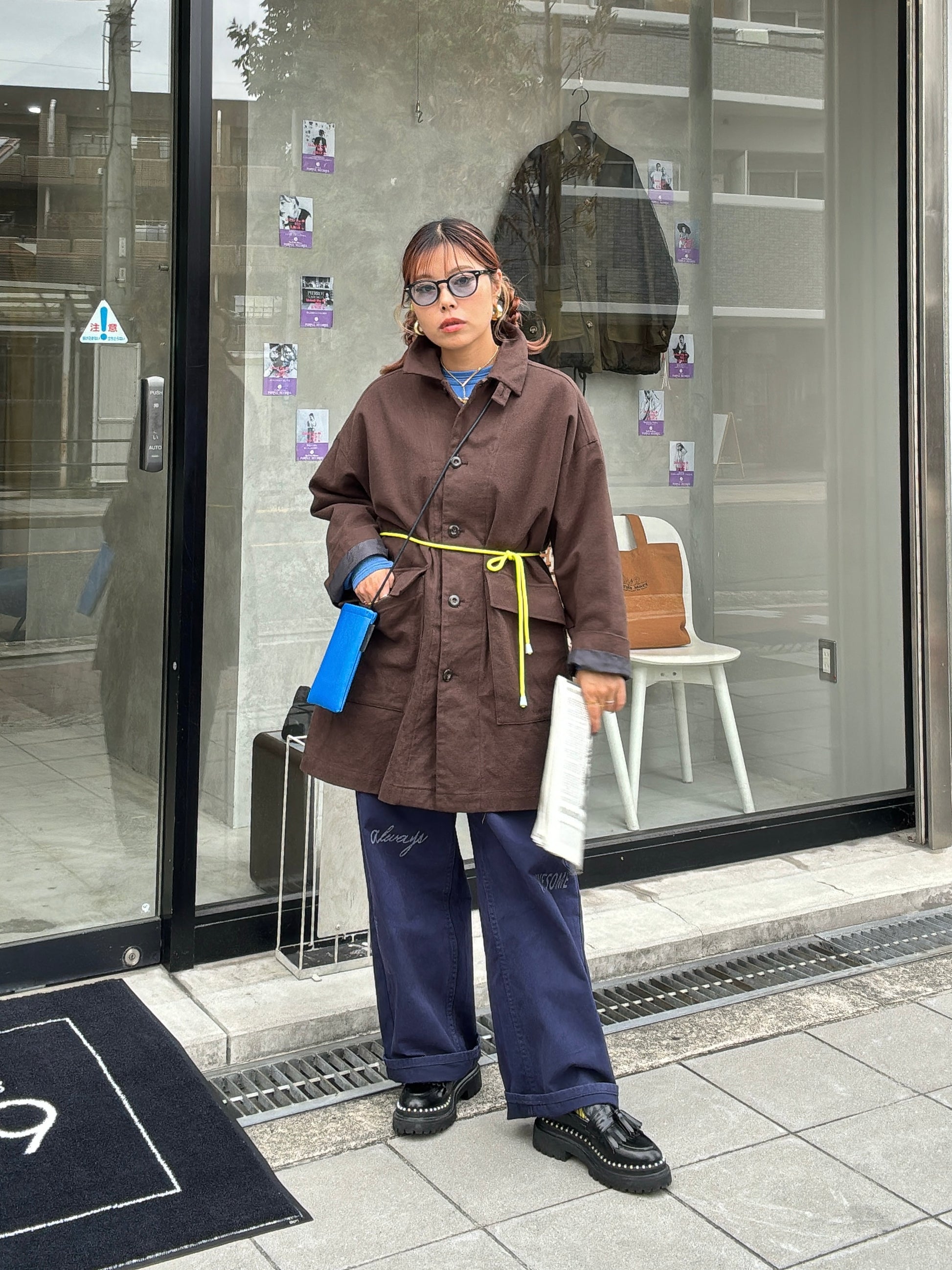 身体をすっぽりと包み込んでくれるようなオーバーサイズのカバーオールで、全体的にかなりゆったりサイズです。細みの男性であれば着用できるくらいゆったりしています。シャツにニットに・・・と重ね着するとどうしてもアウターが難しくなるけど、このアウターならどんな重ね着コーデでも包み込んでくれます!