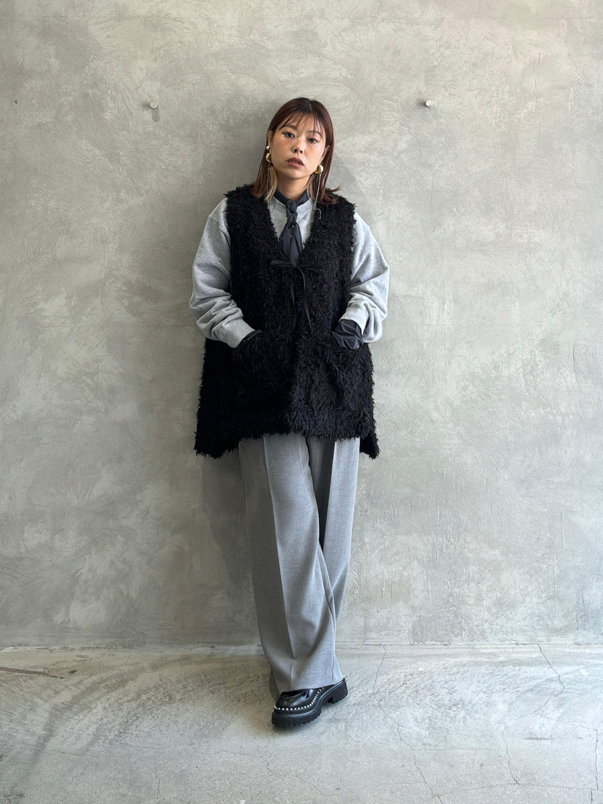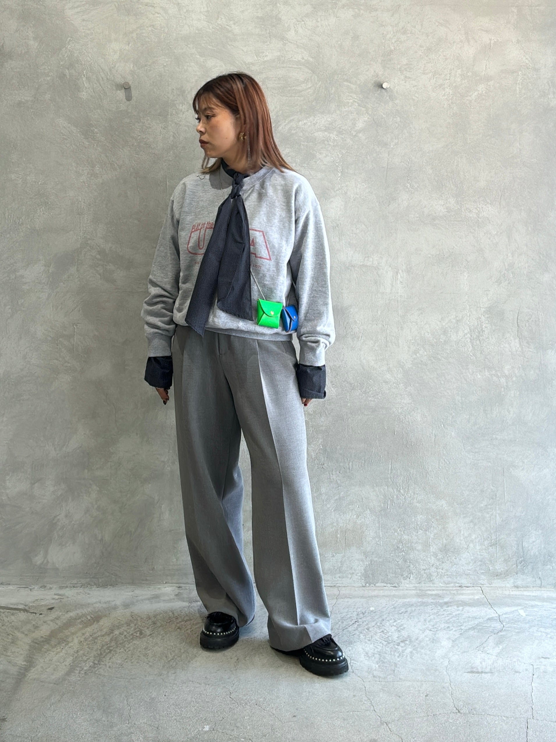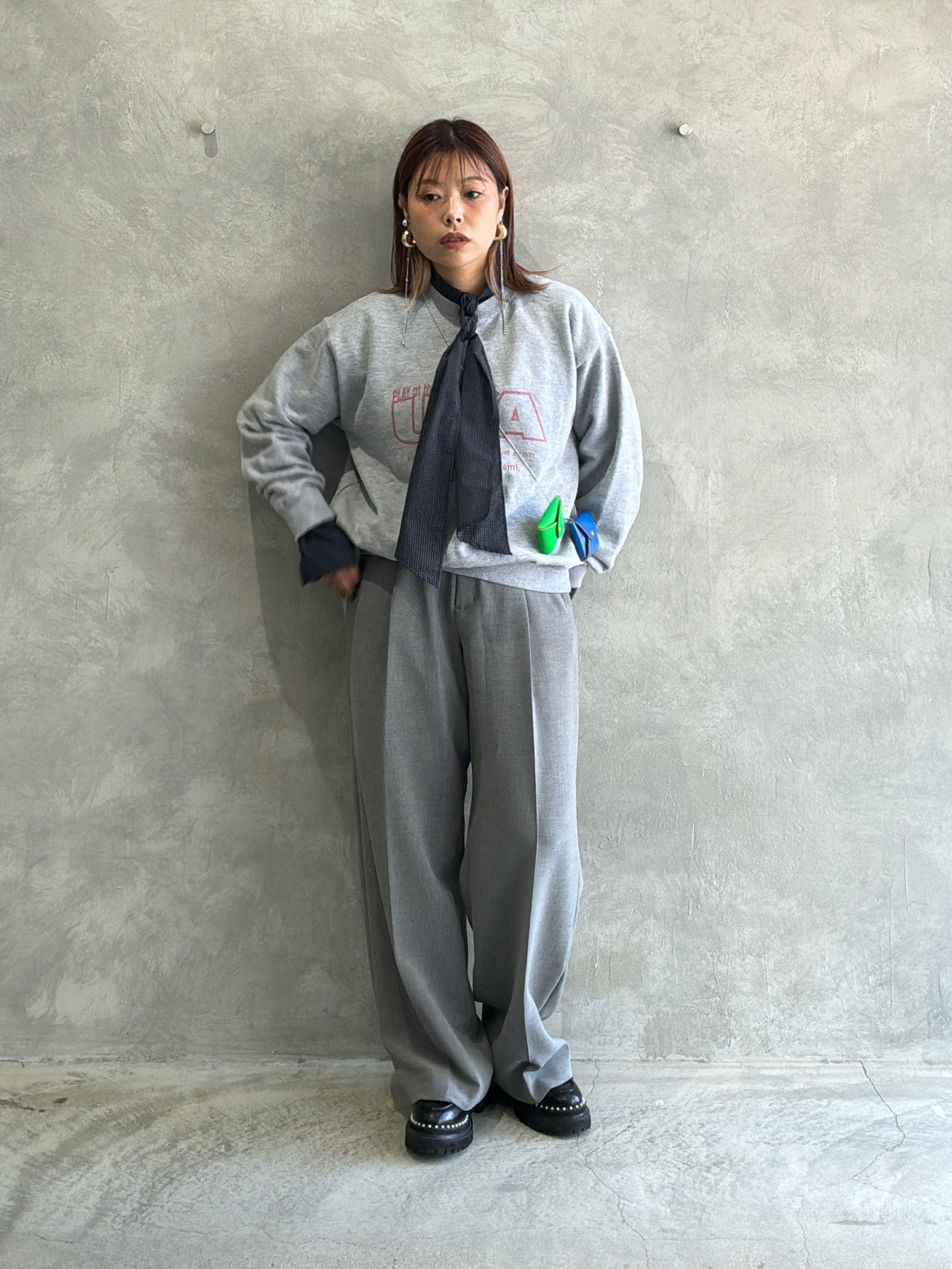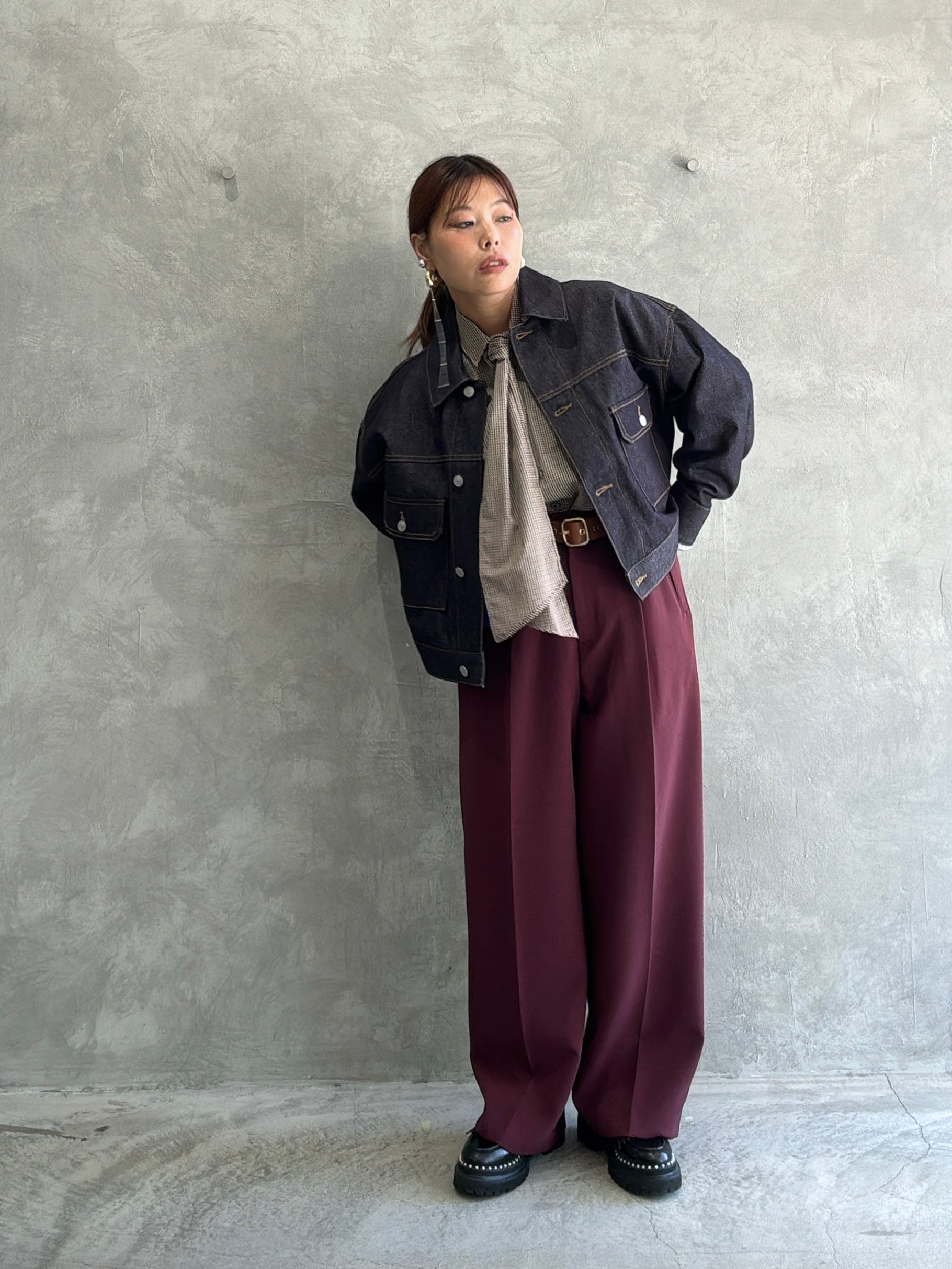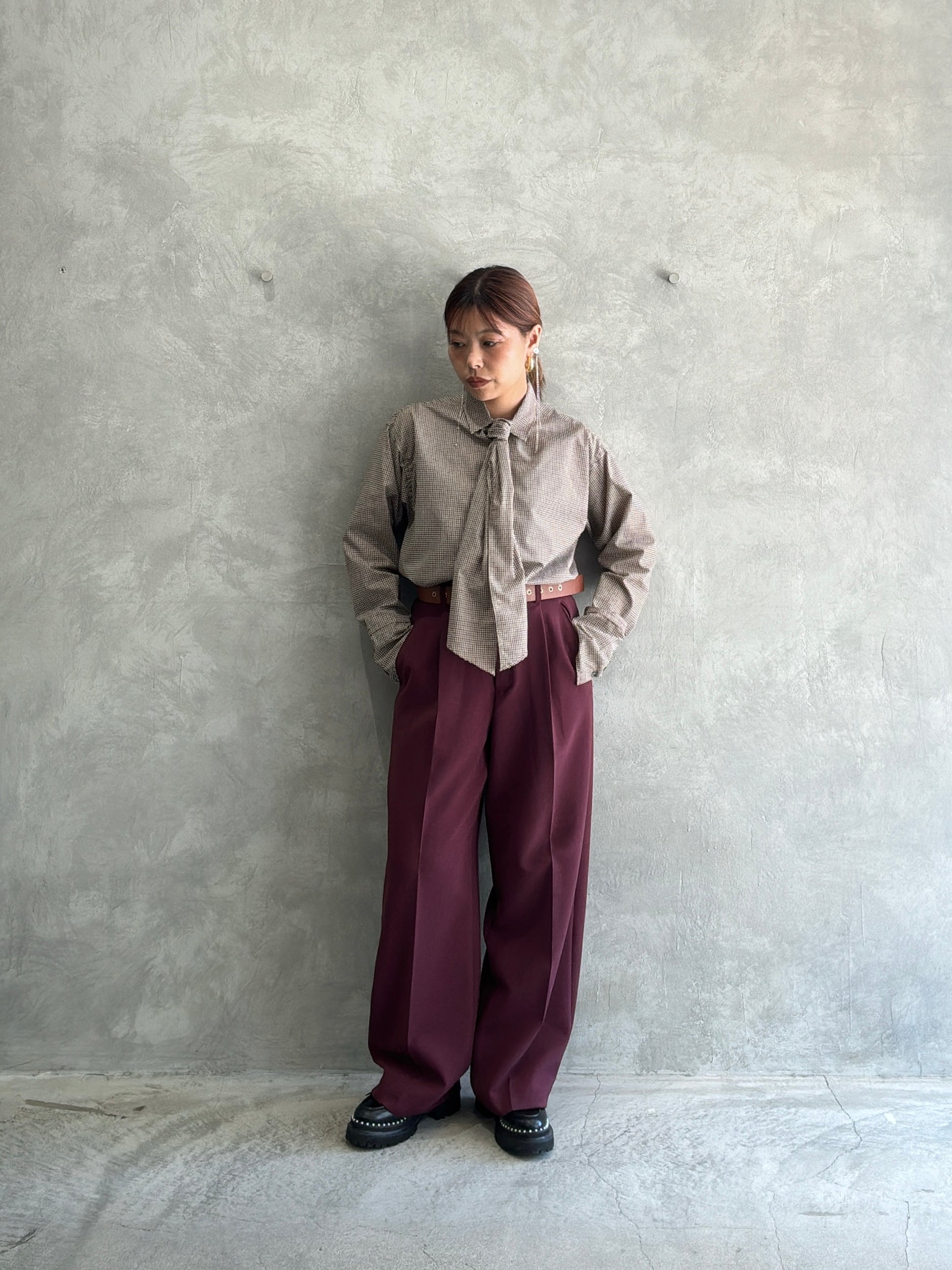 個人的には写真でもしているような、タイ付きのブラウス とニットとのコーデのボトムスにおすすめ。パンツの形自体も綺麗なので、お手持ちのトップスやニットとも合わせていただけます^^