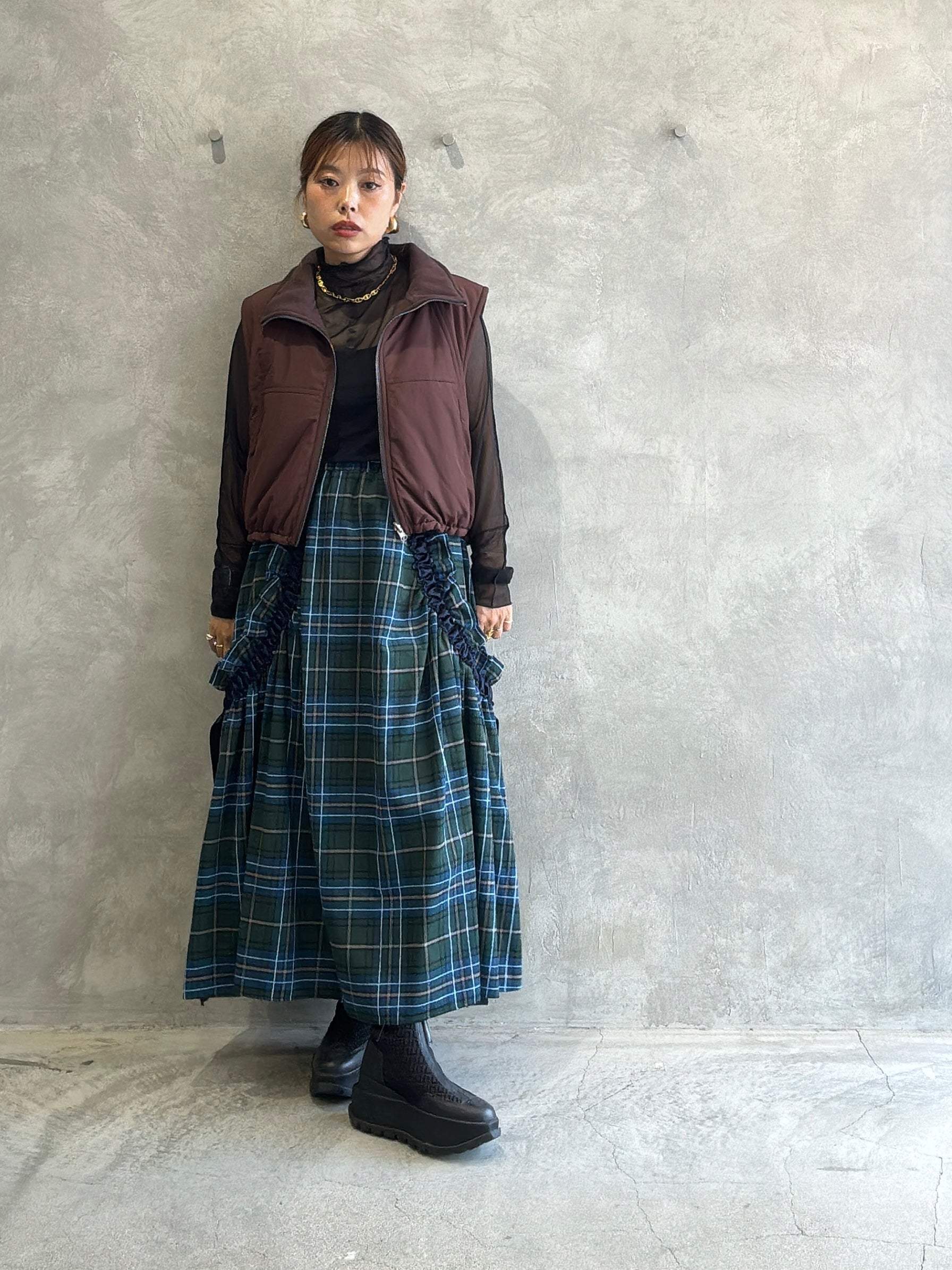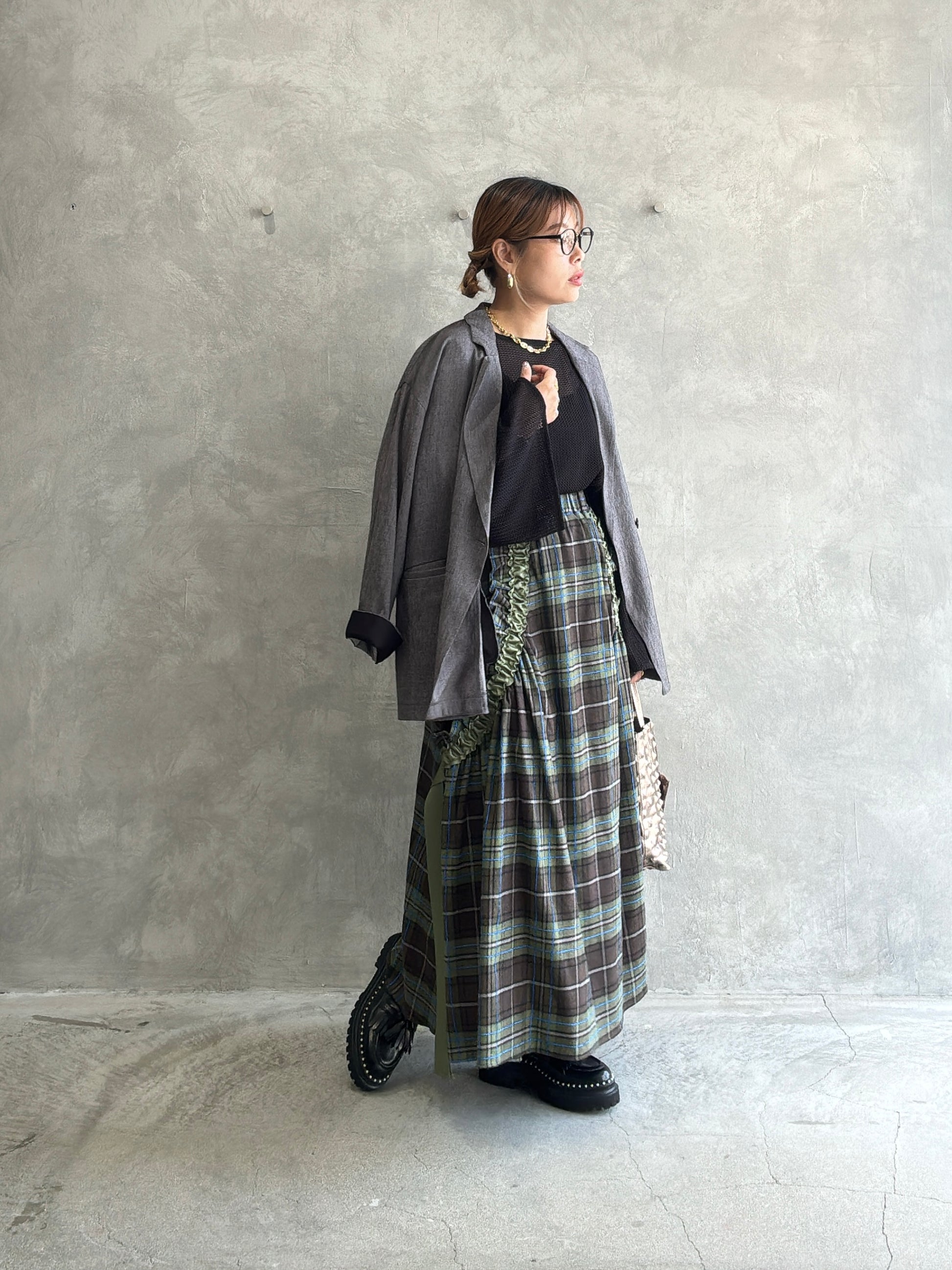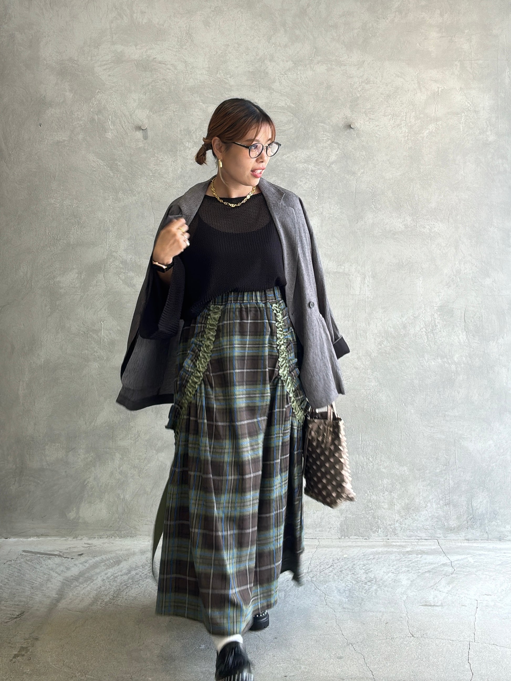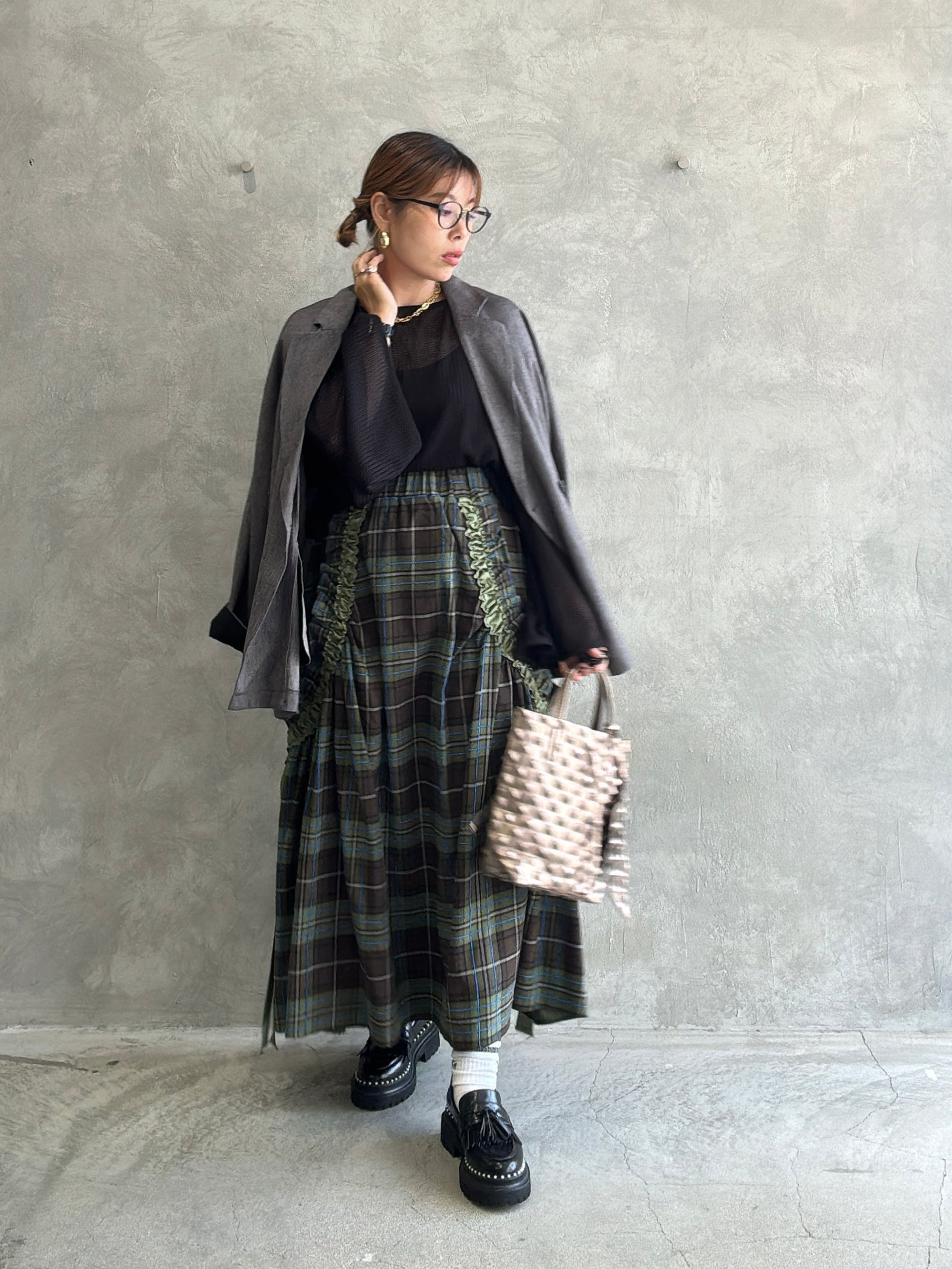 こちらは新しくお取り扱いを始めるブランドさんのアイテムで、ちょっとガーリーな雰囲気が強めなんですが、秋冬にはこれくらい主役感のあるスカートを履きたい!と思ってセレクトしました。