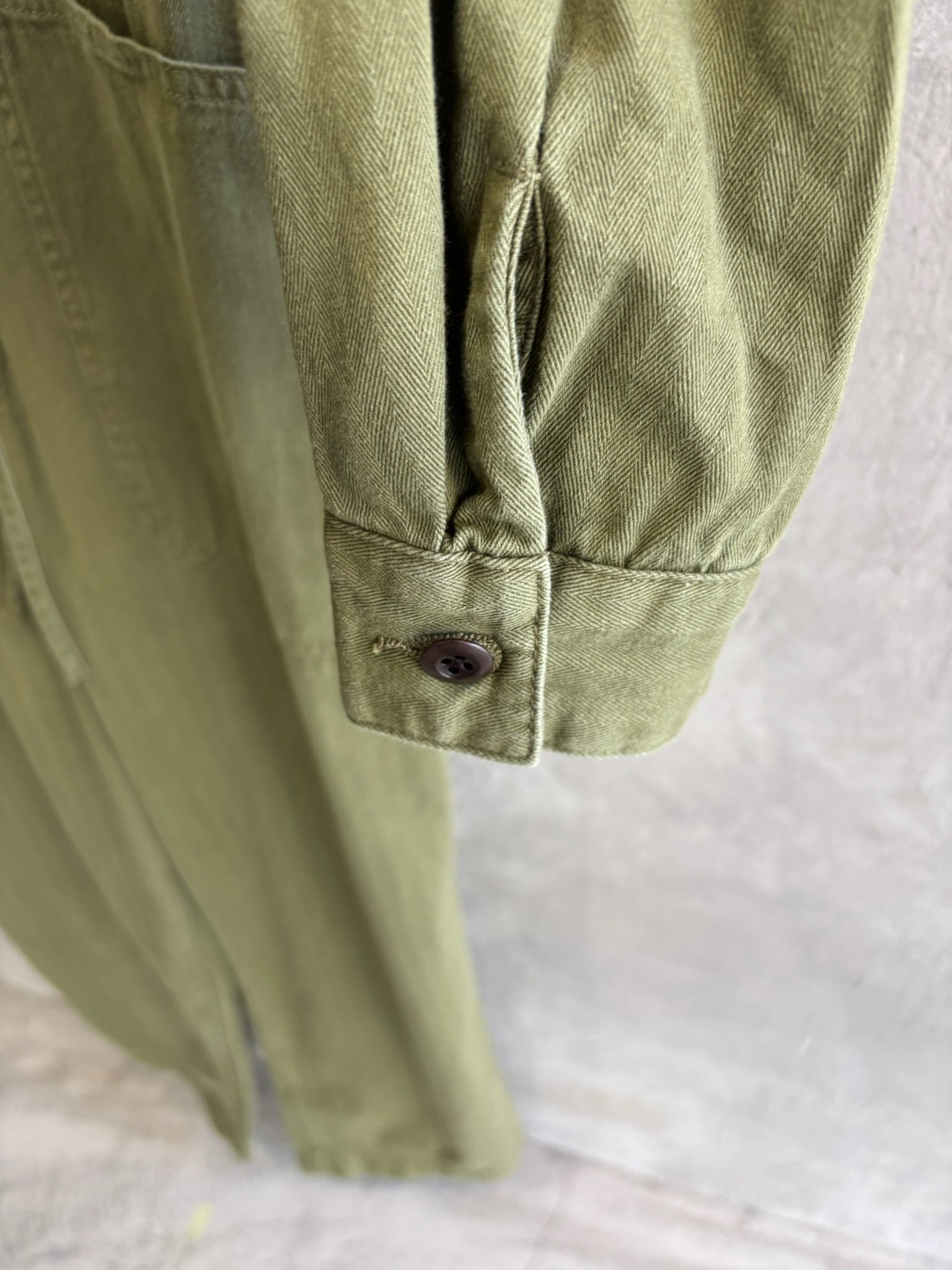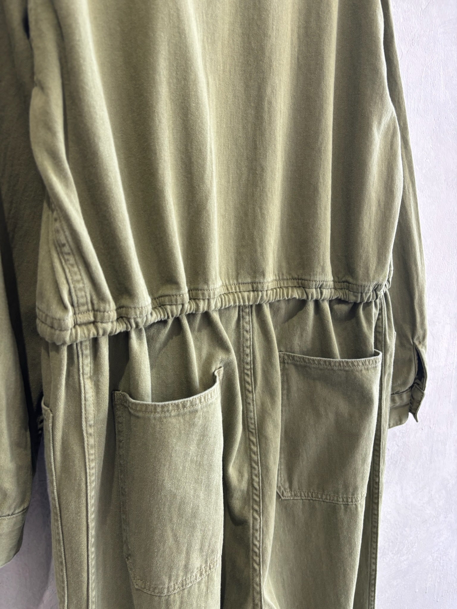 首元がVネックになっている珍しいデザインのツナギでウエストには紐が通っていて、ウエストのフィット感を調整できるようになっています。このウエストの紐も縛った時に綺麗に生地が寄るように紐を通す部分も立体的に細めにデザインされています。また、ウエストを絞ると腰元のポケットも立体感が出るようにコチラもデザインされています。