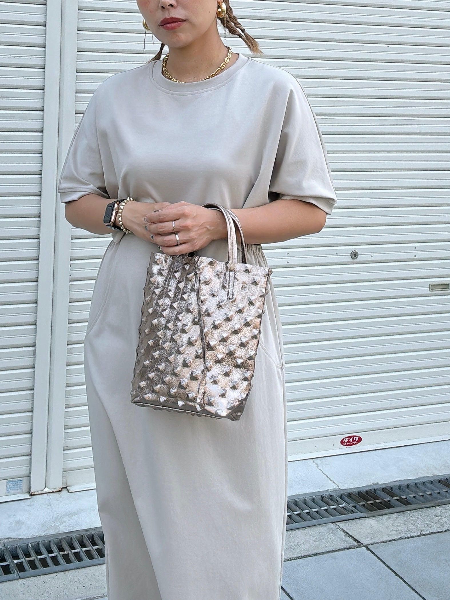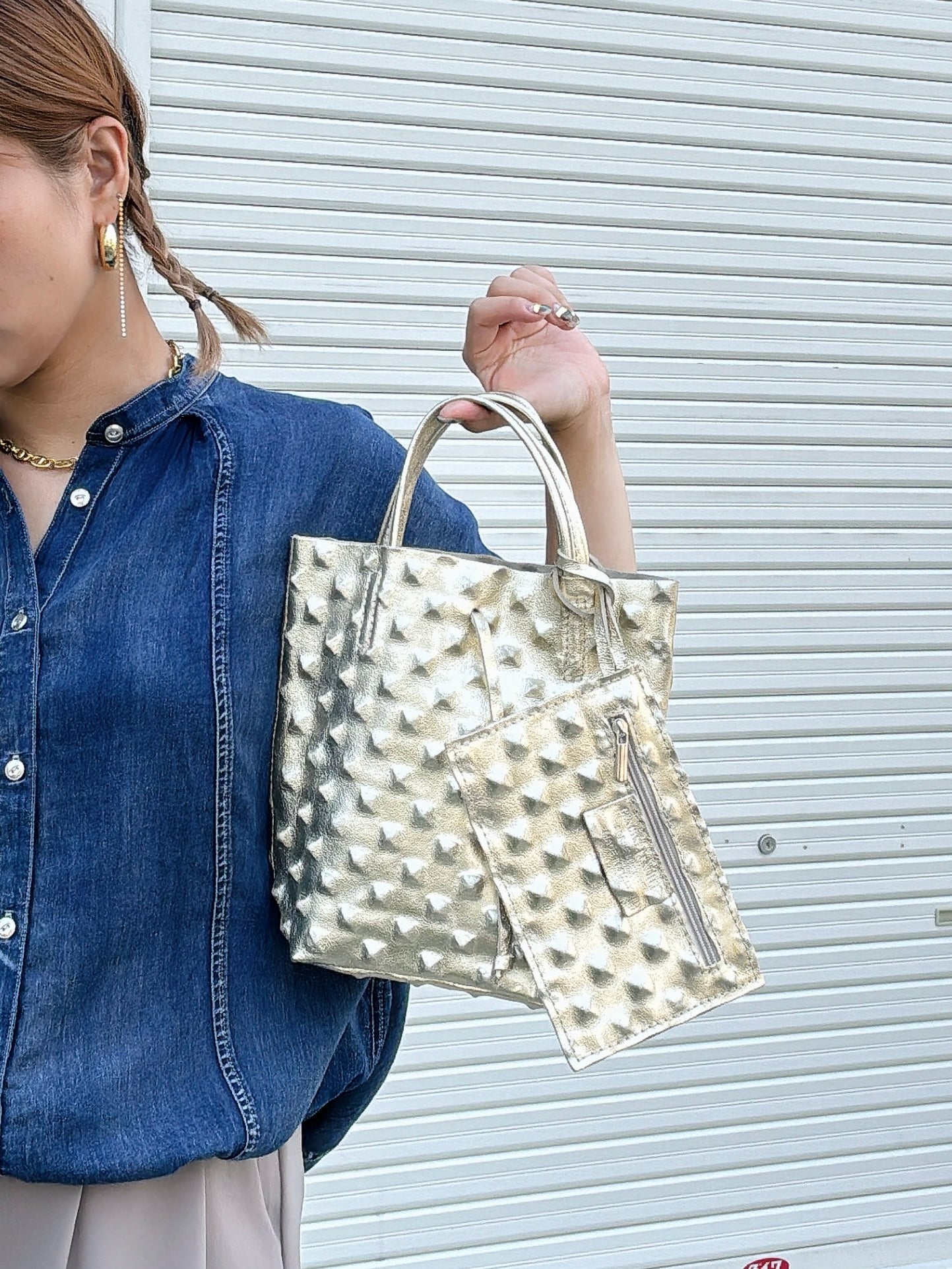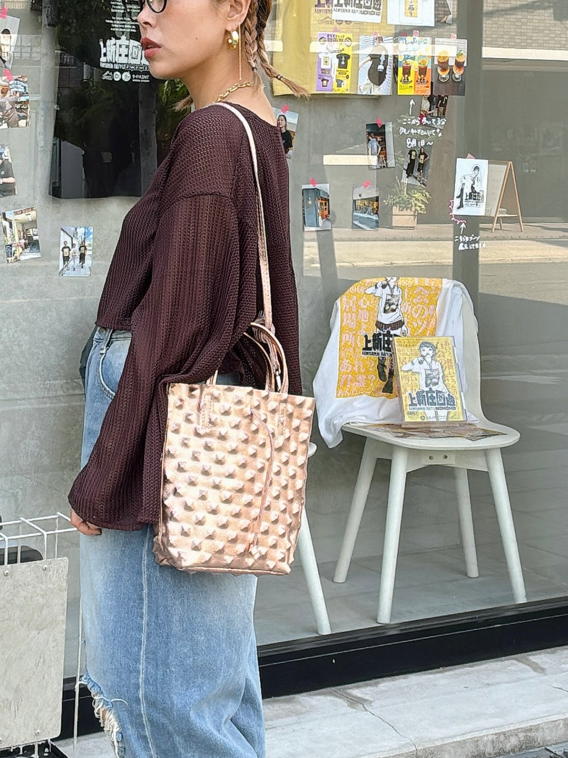 レザーにスタッズで型押しされた、凹凸感が他にないデザイン。見た目のインパクトもありながら、ちゃんとおしゃれで上品にまとまってるのが魅力のバッグです