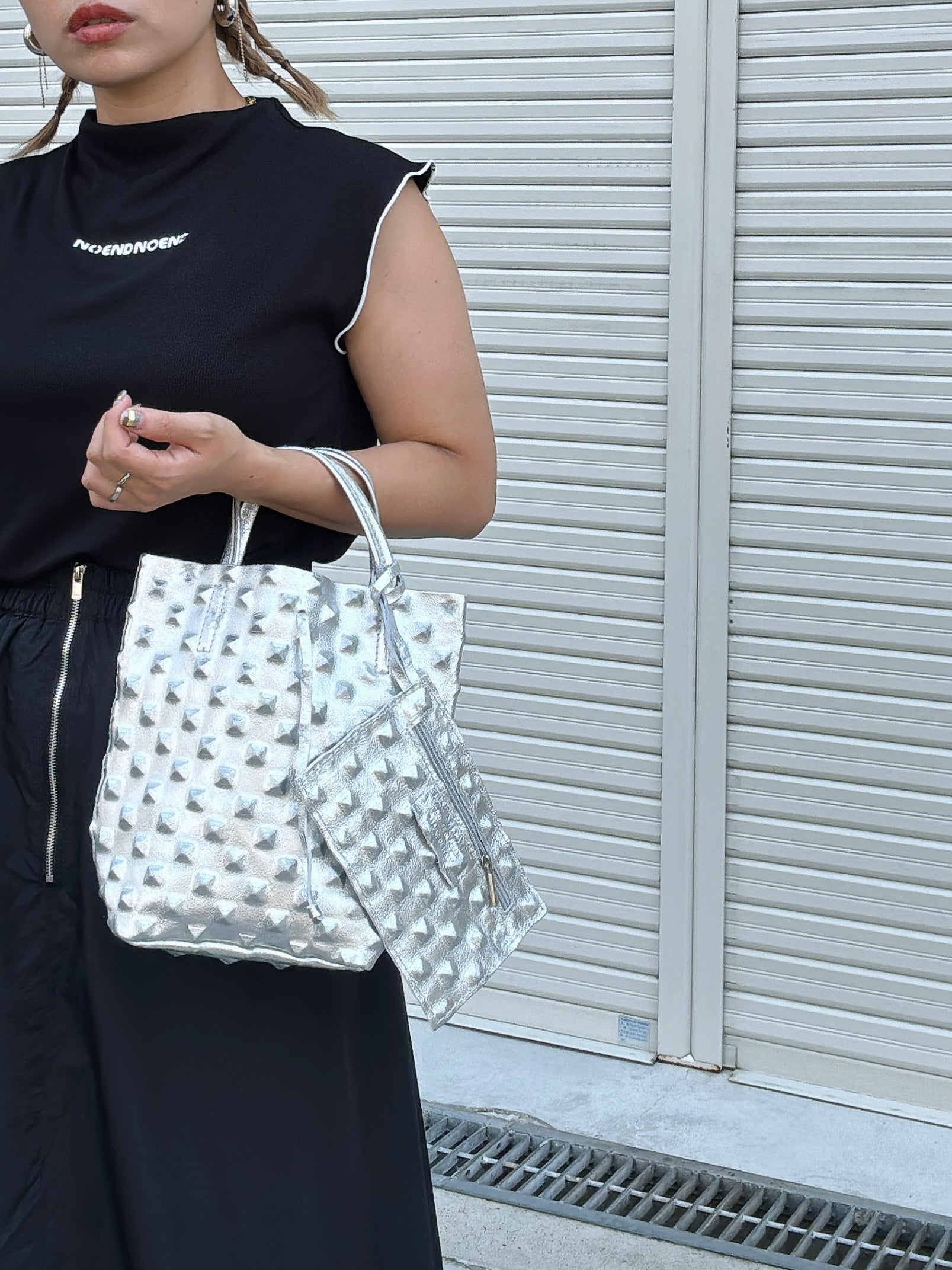 ここ数年シルバーを中心にキラキラ系の小物がトレンドで、メタリックのバッグって使いやすい!と実感している方もいらっしゃると思います。ザナインズでも何度かご紹介してますが、今回のアイテムはハードなスタッズとレザーの高級感がかけ合わさって、また一味違う雰囲気で楽しんでもらえるはずです!