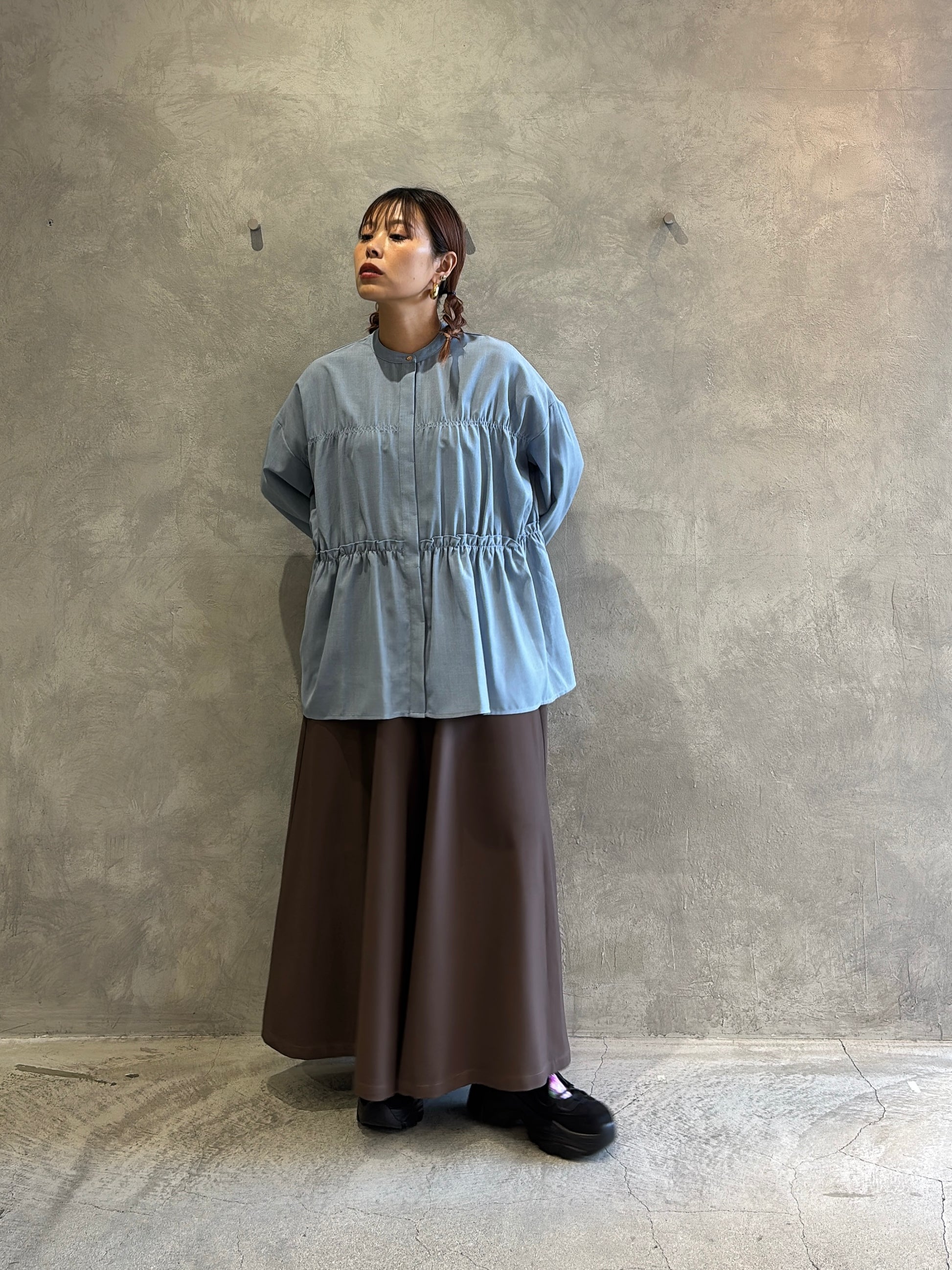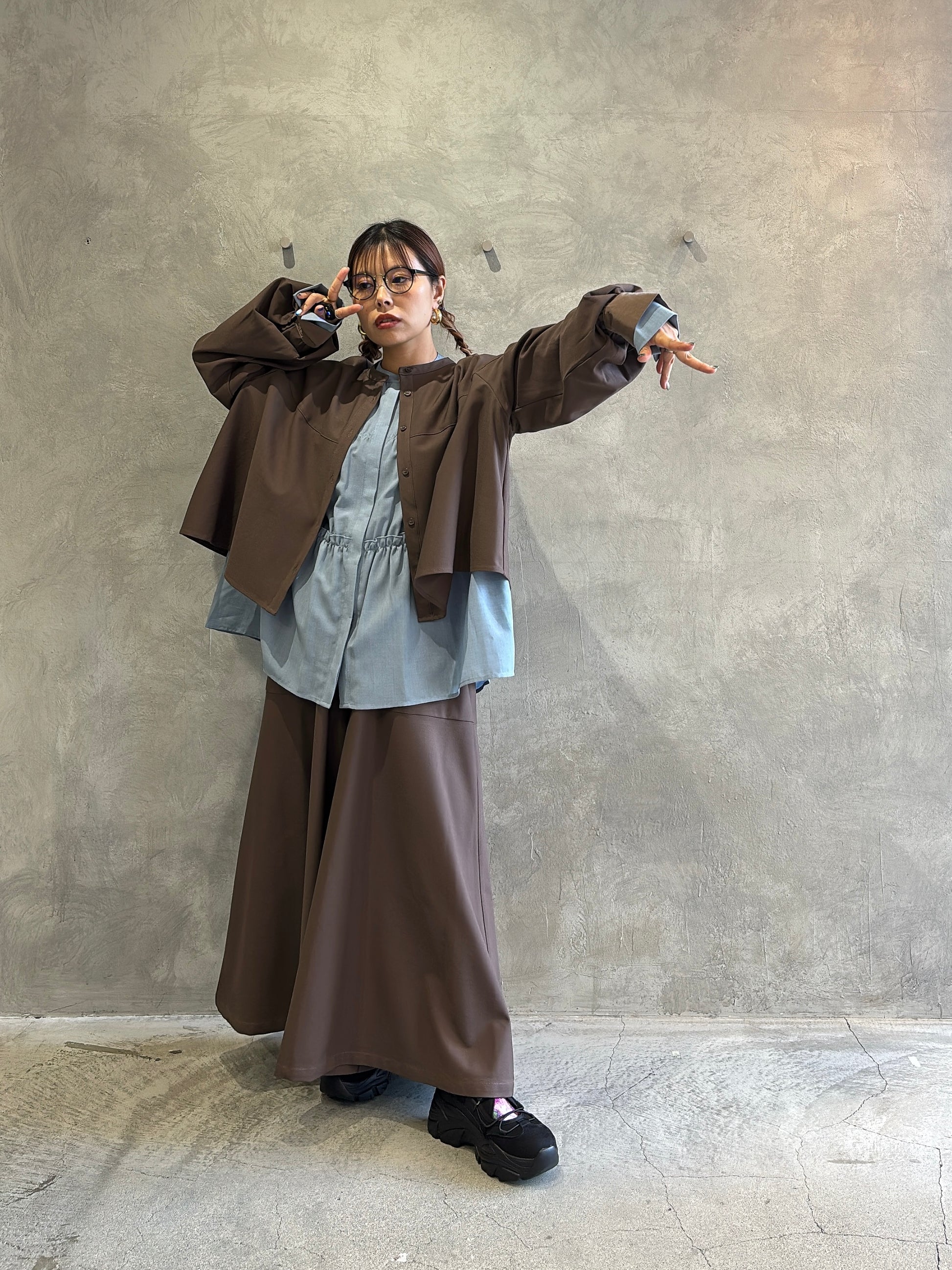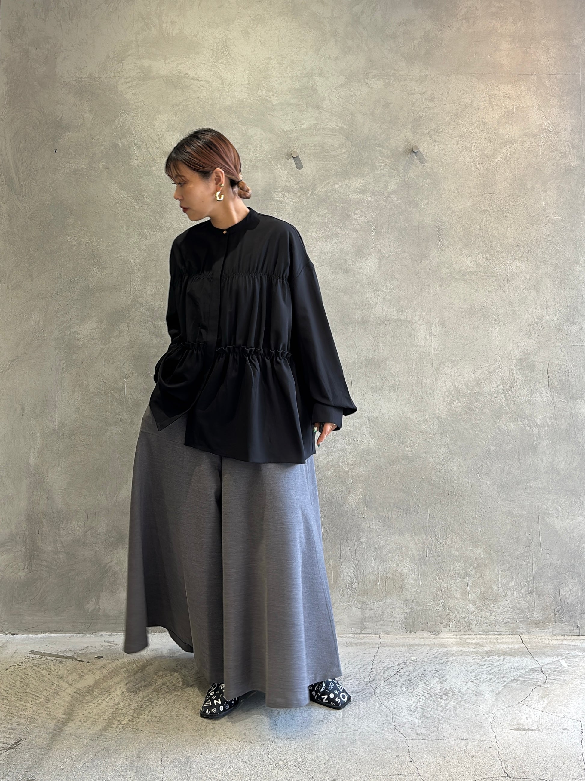 今回のCYAN TOKYOの展示会で、ティアードブラウスに並ぶほど心をつかまれたのがこのガウチョパンツ。ヒラミ的にも“かなりのヒットアイテム”で、色違いで揃えたくなるくらいの推しパンツです。