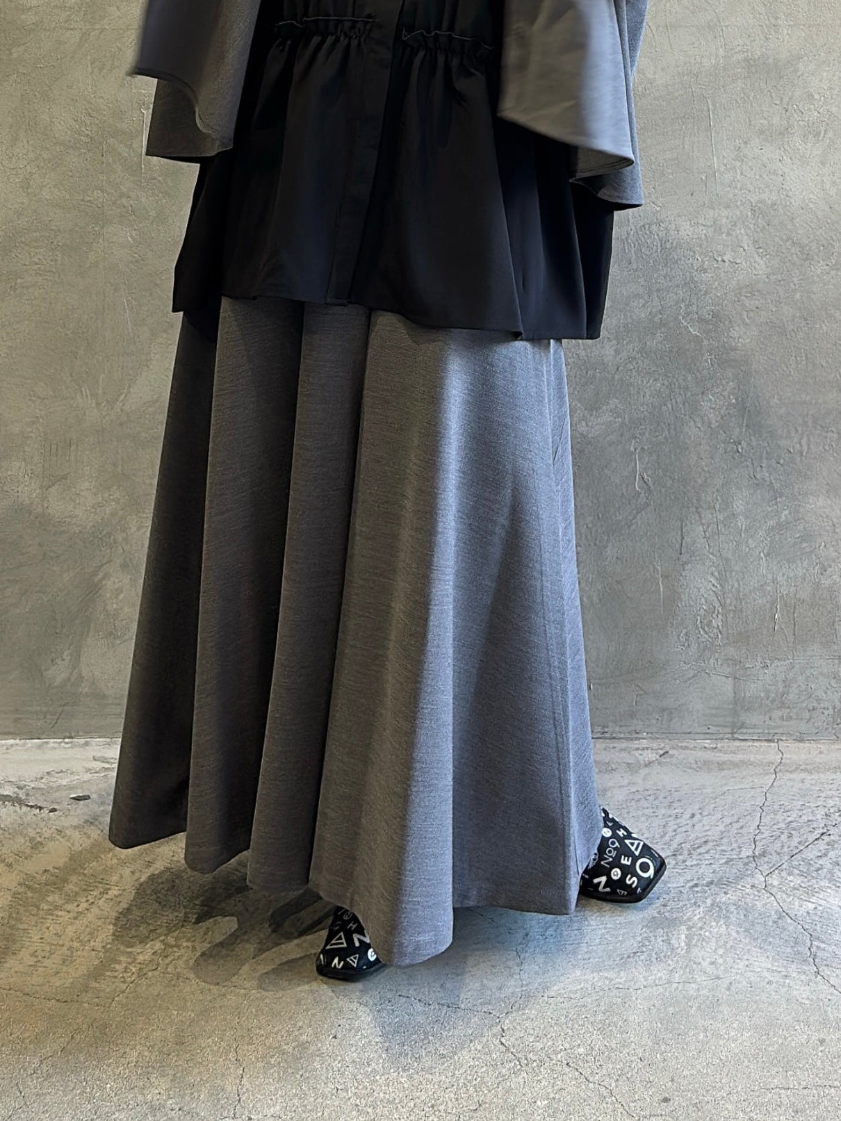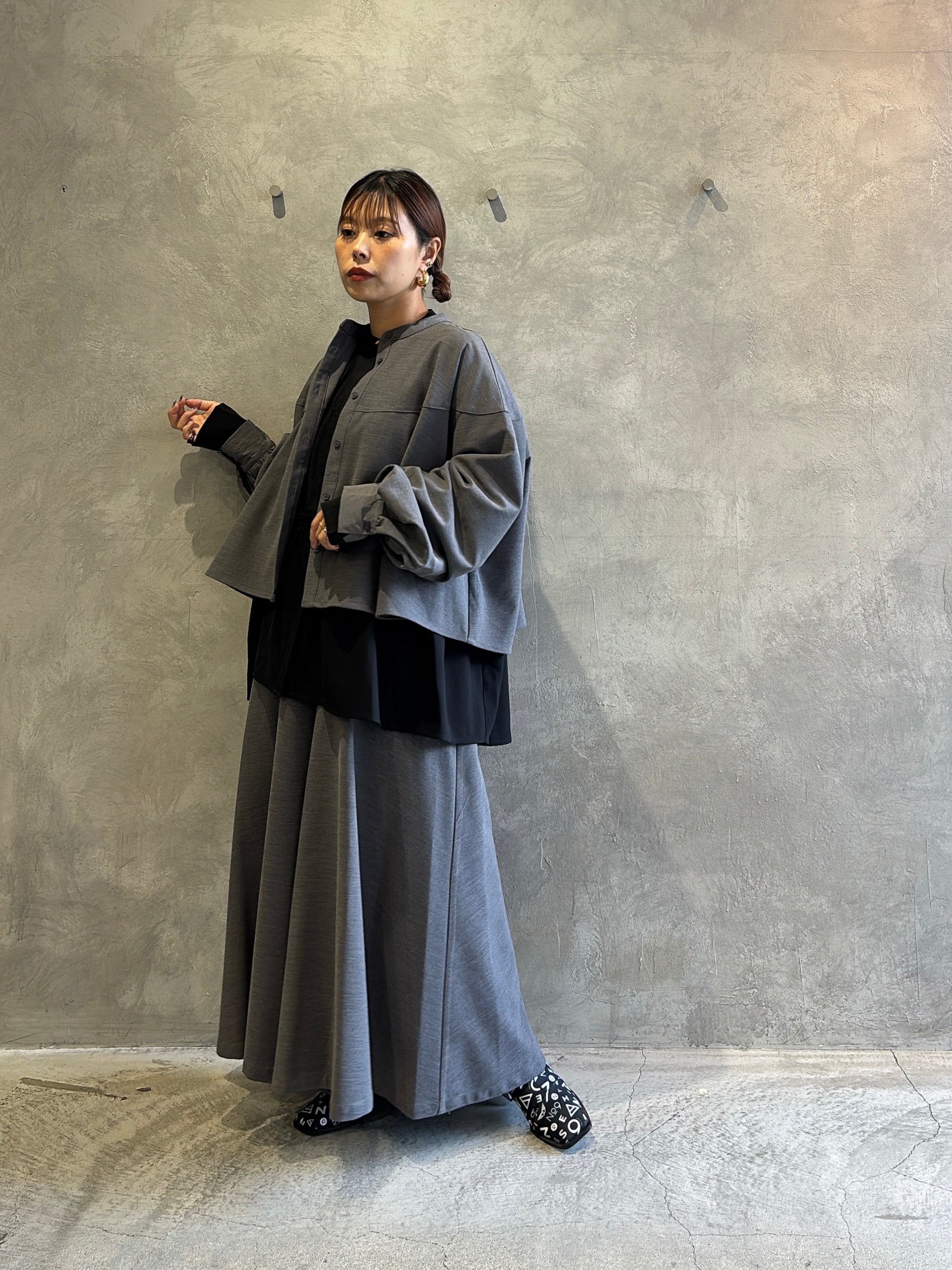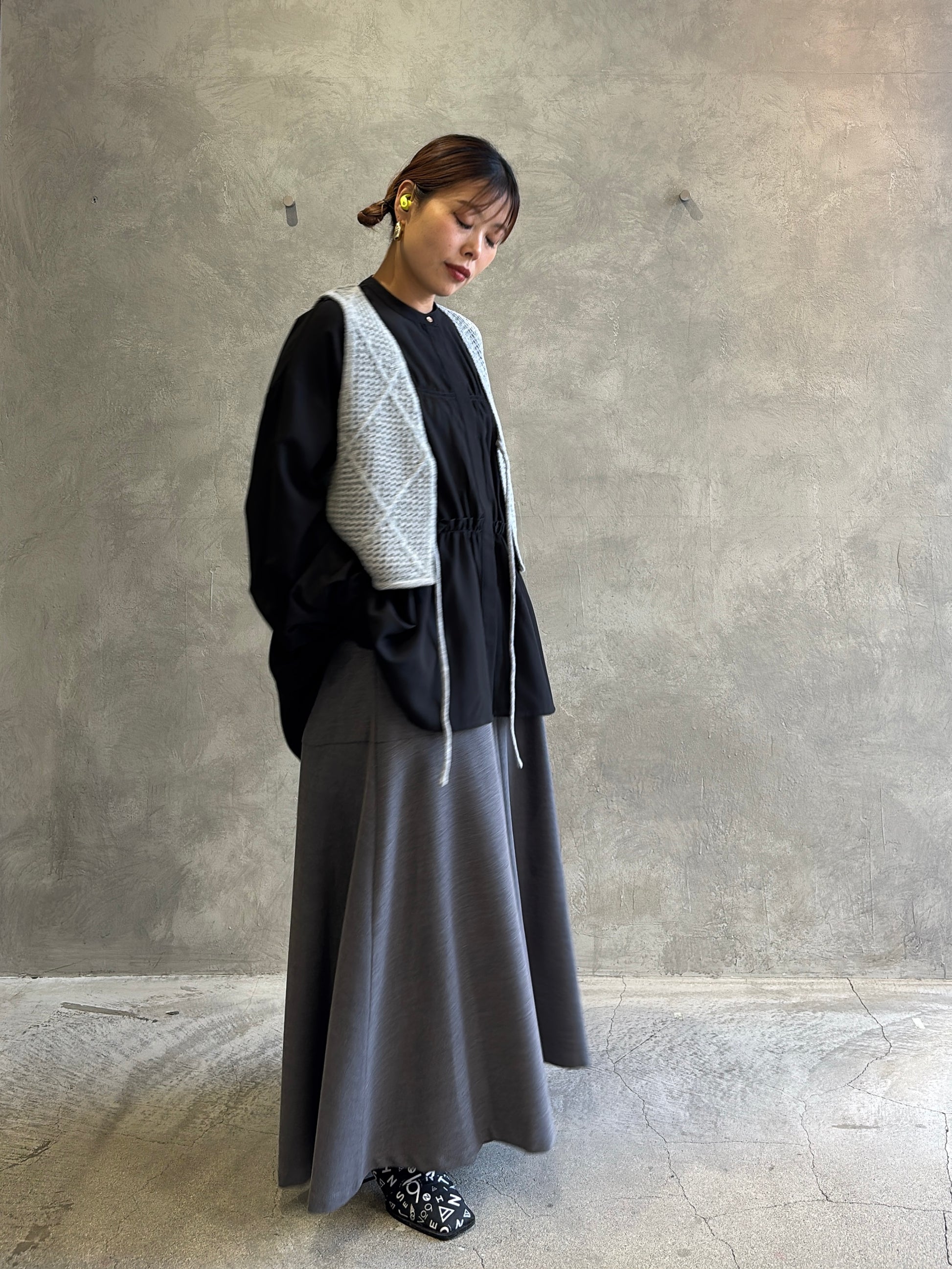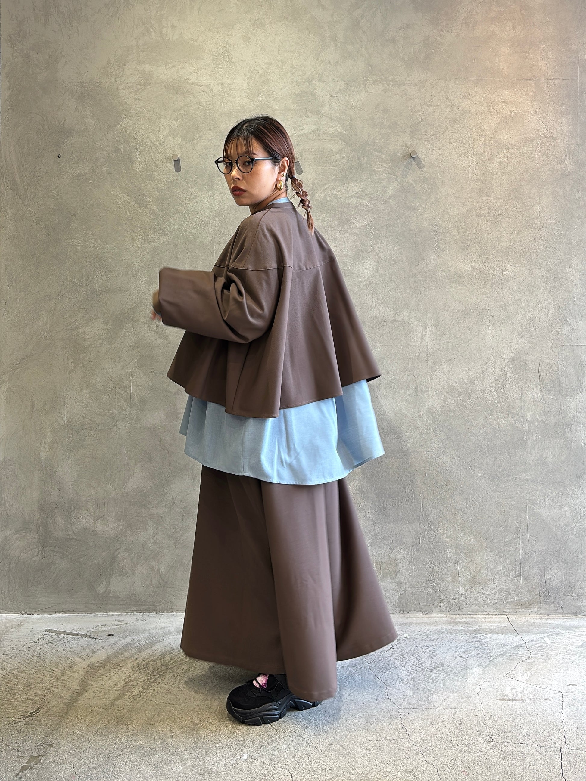ヒップや太ももまわりに生地がたっぷりと使われていて、動きに合わせて美しいドレープが生まれます。締めつけがないぶん、冬場はタイツやレギンスなど中にしっかり着込むこともでき、寒がりさんにも安心。