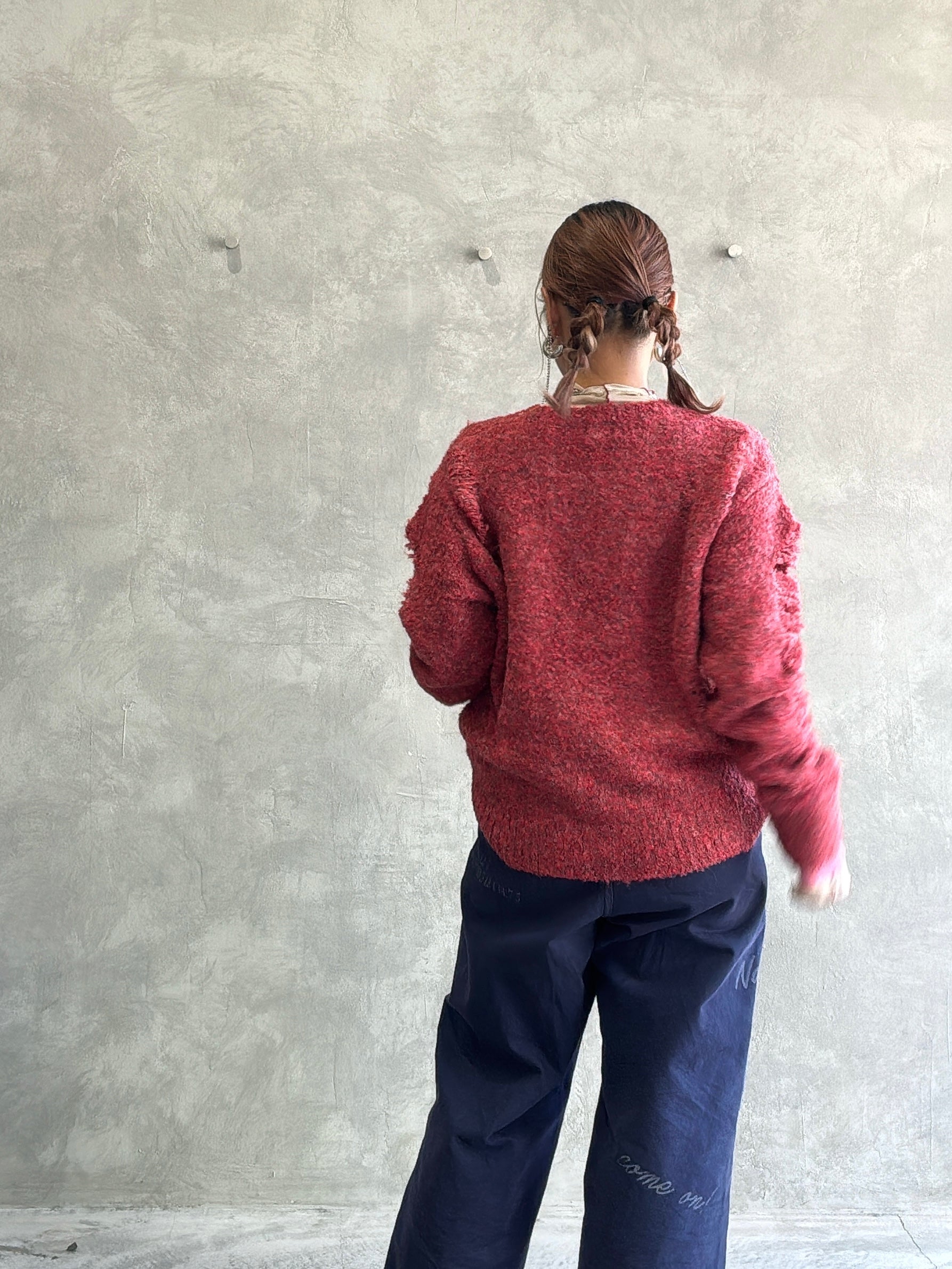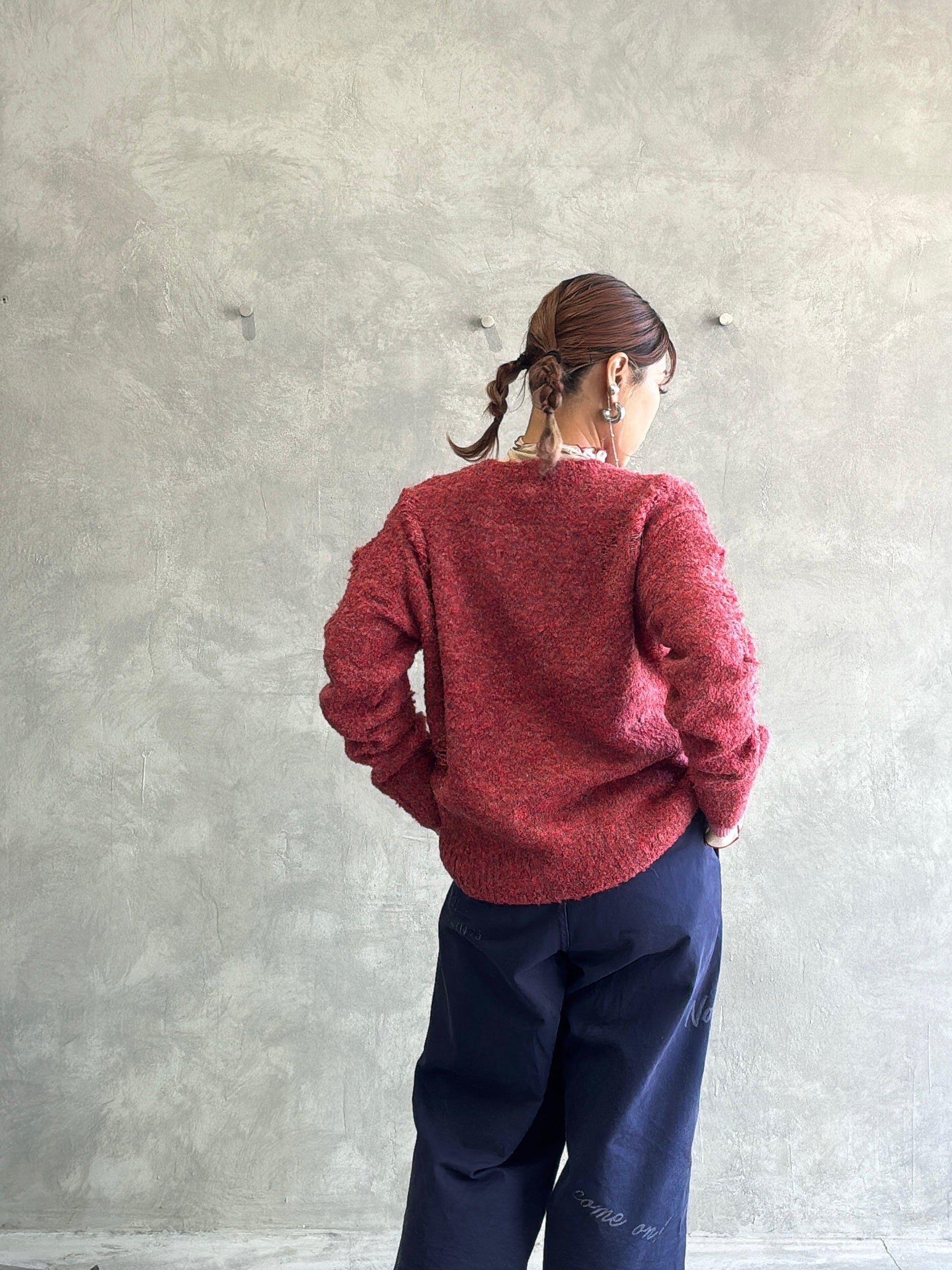 全体はポコポコとした立体感のある糸で編まれていて、その糸の凹凸がそのまま自然なダメージ感を生み出しています。