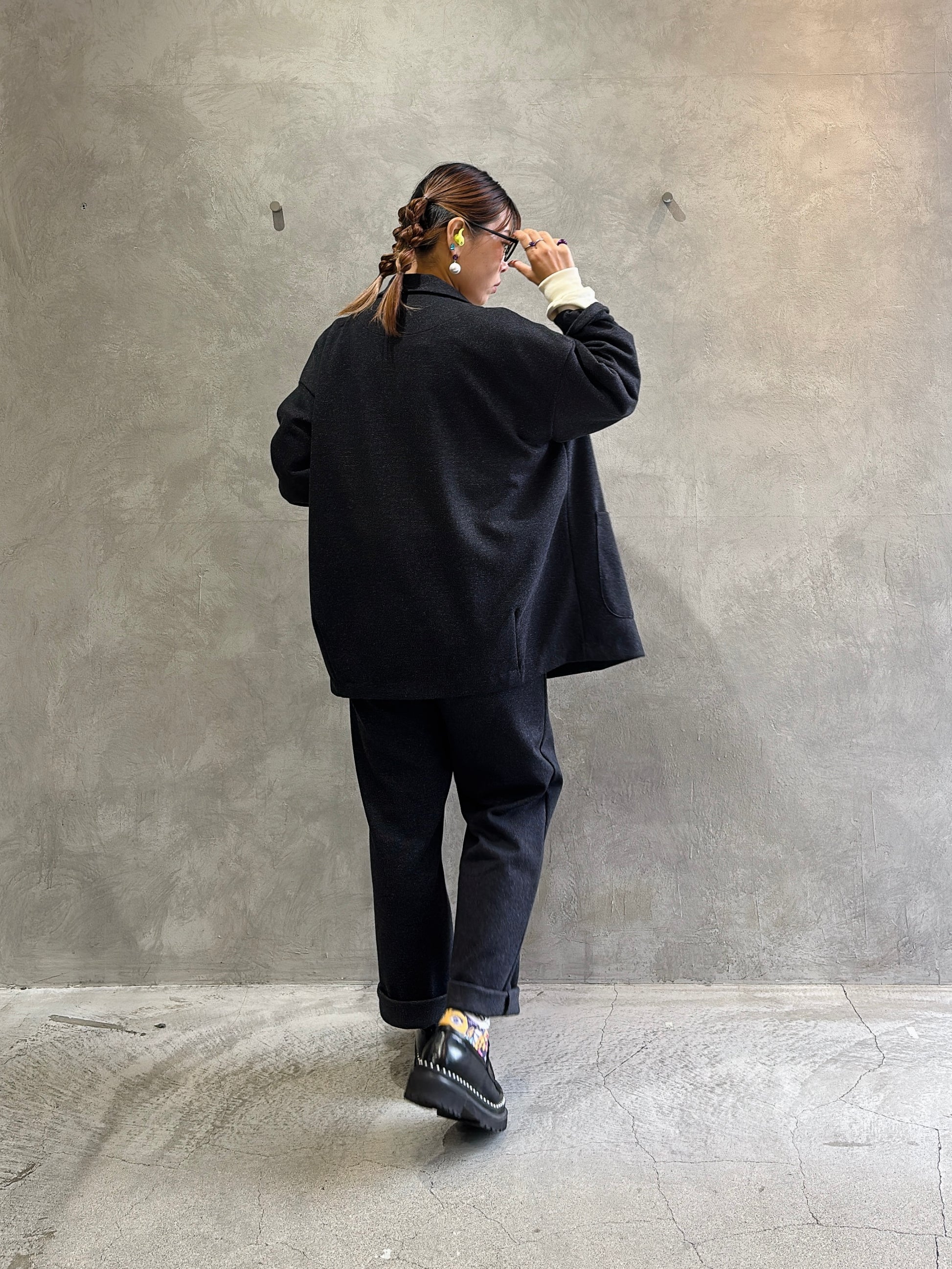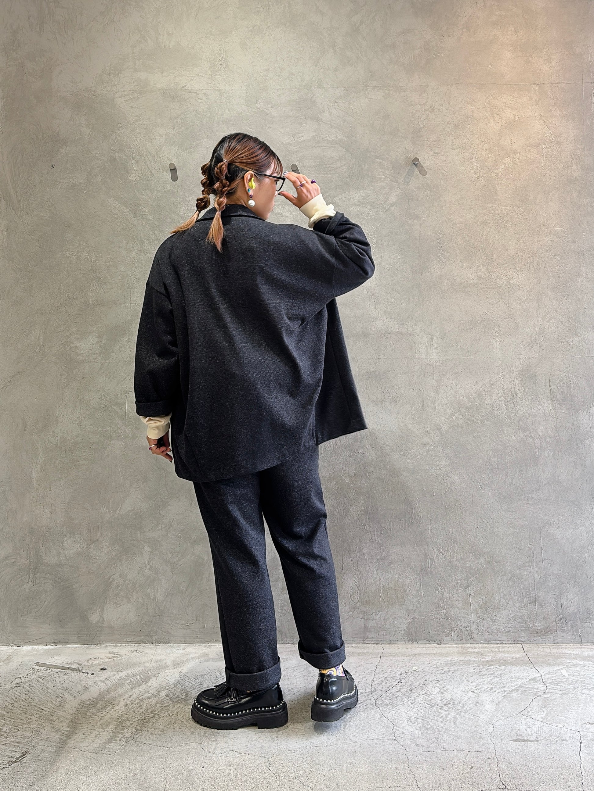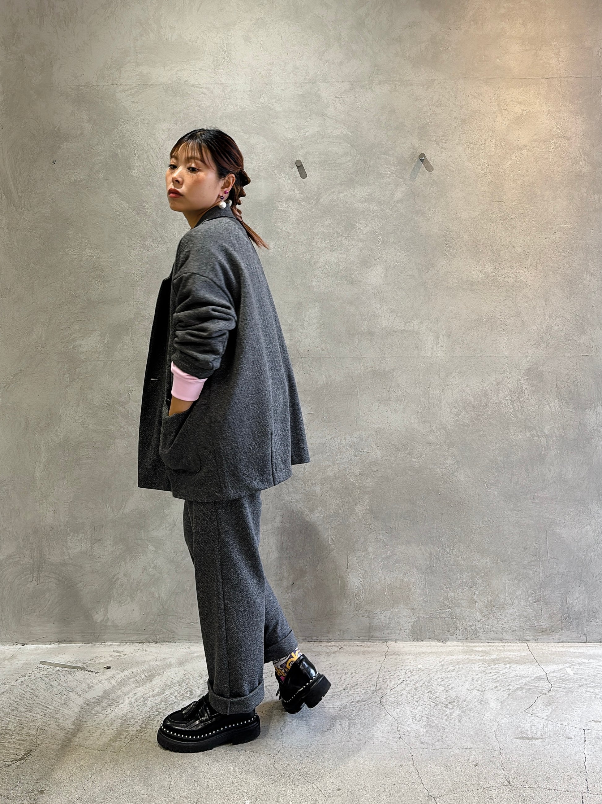 同素材のウールタックパンツと合わせて、中にはあえてスウェットを仕込むスタイリングがおすすめ!