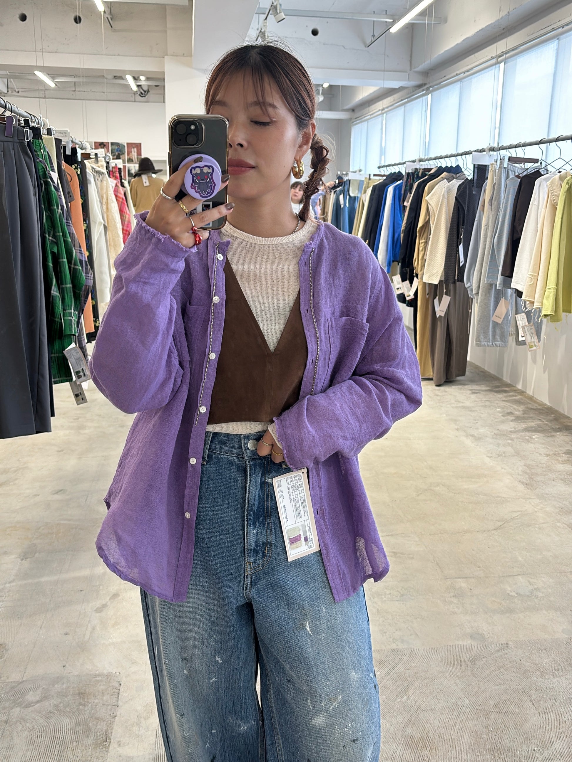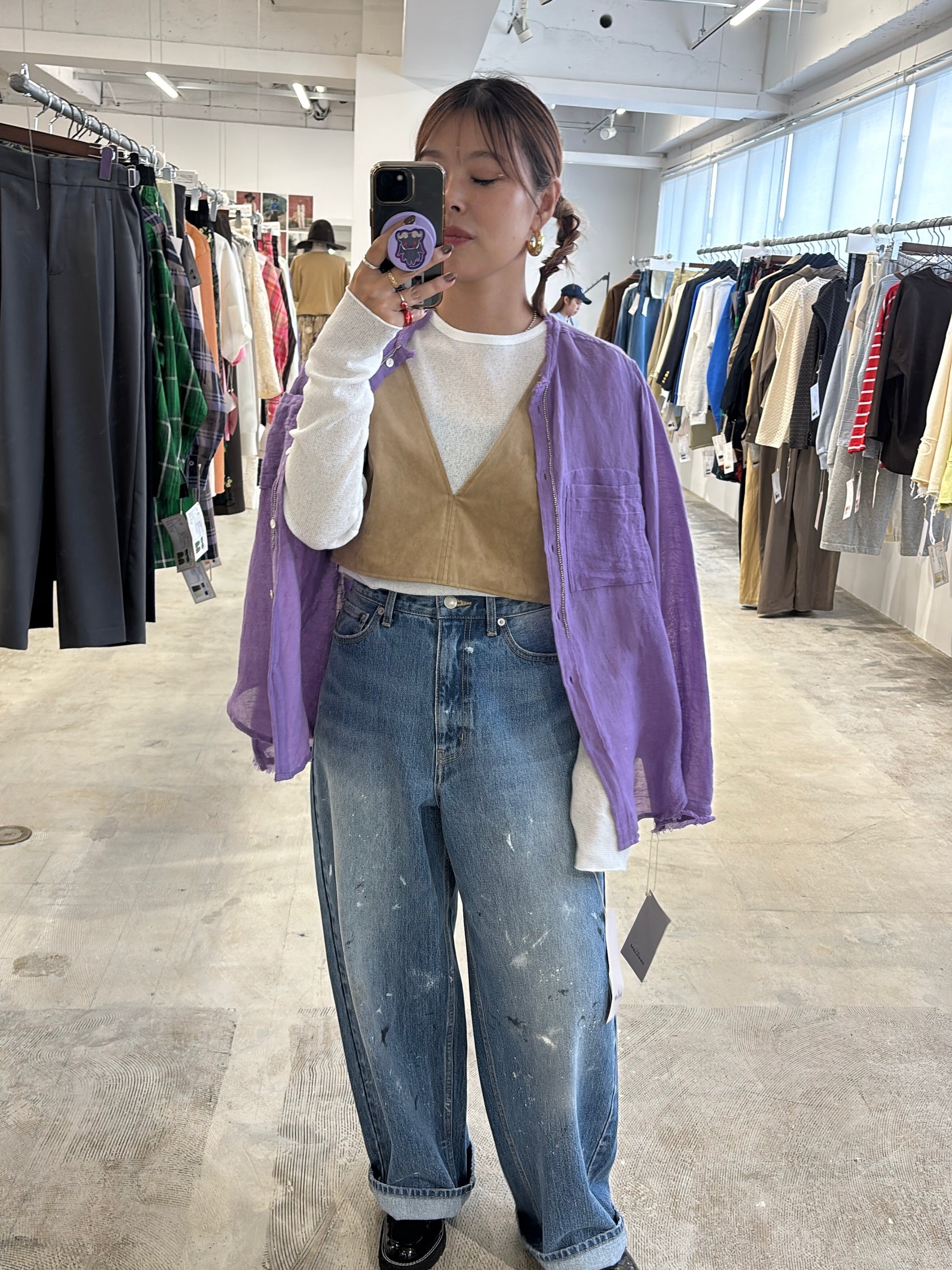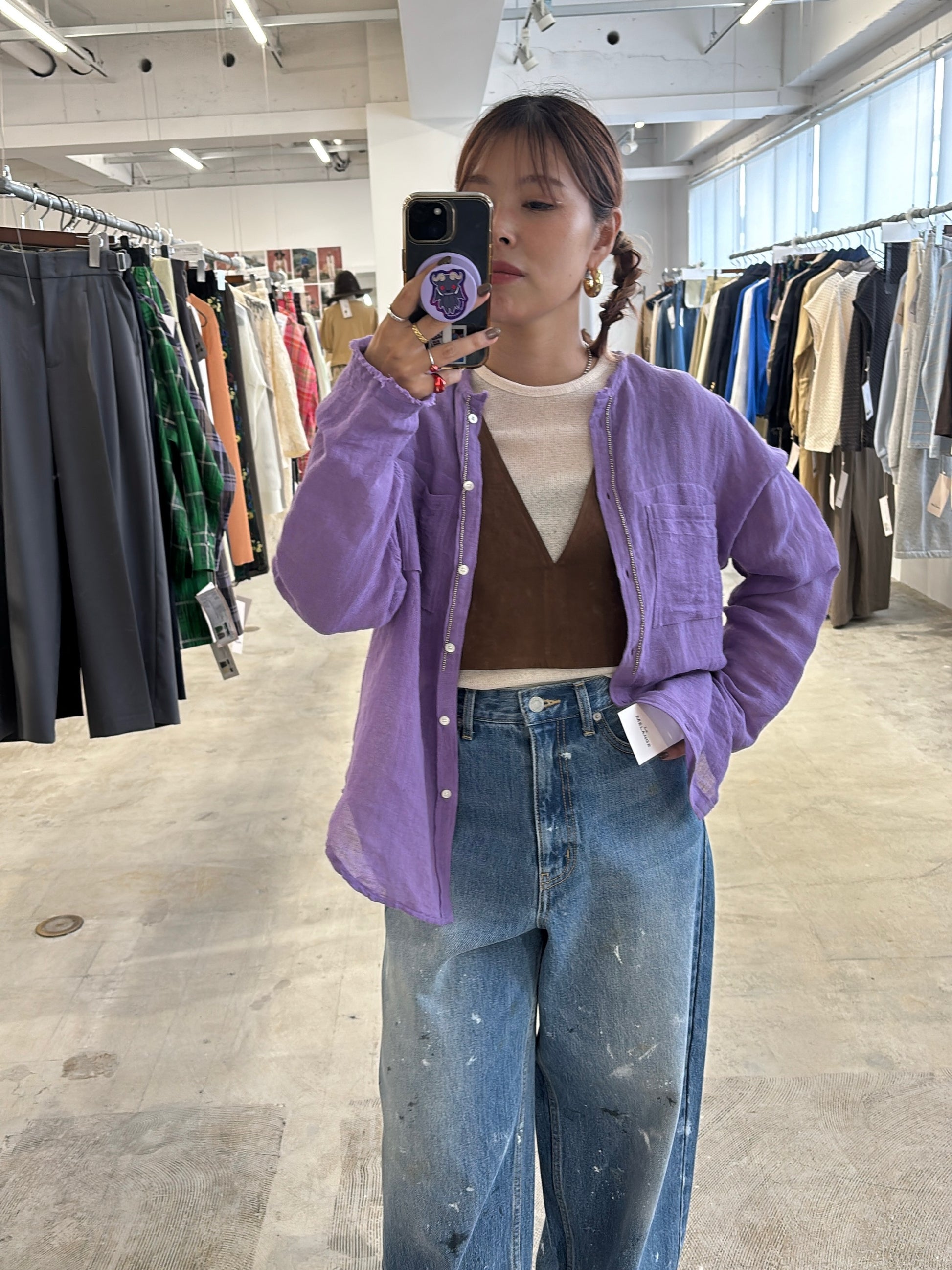カラーは秋冬に登場していたような深めのパープルとは違い、今回は少しパステル寄りのやわらかいパープル。ヒラミはどちらかというとパステルカラーが得意ではないんですが、このリネンコットンの軽やかな生地感のおかげで、甘さが出すぎず程よい抜け感に仕上がっていました。