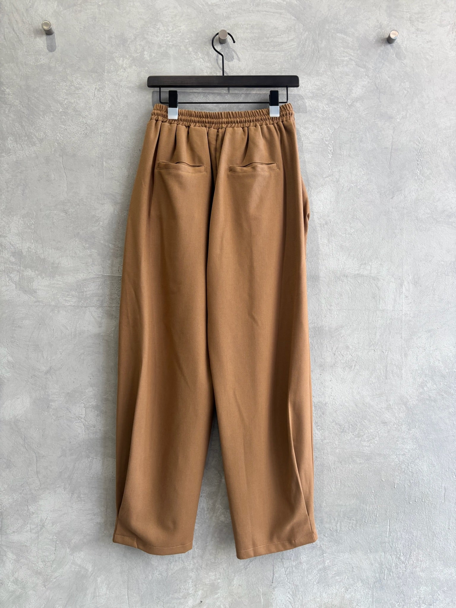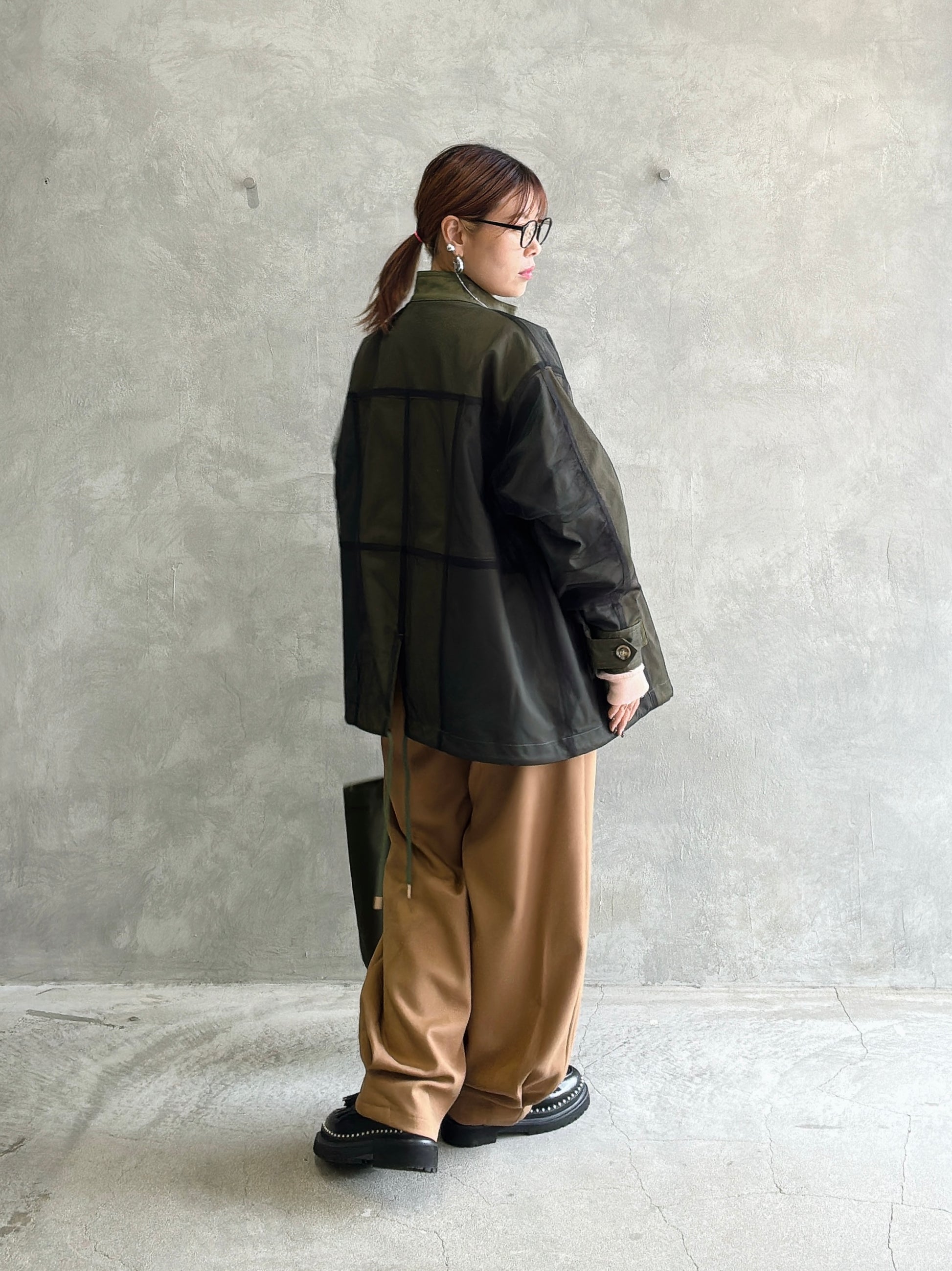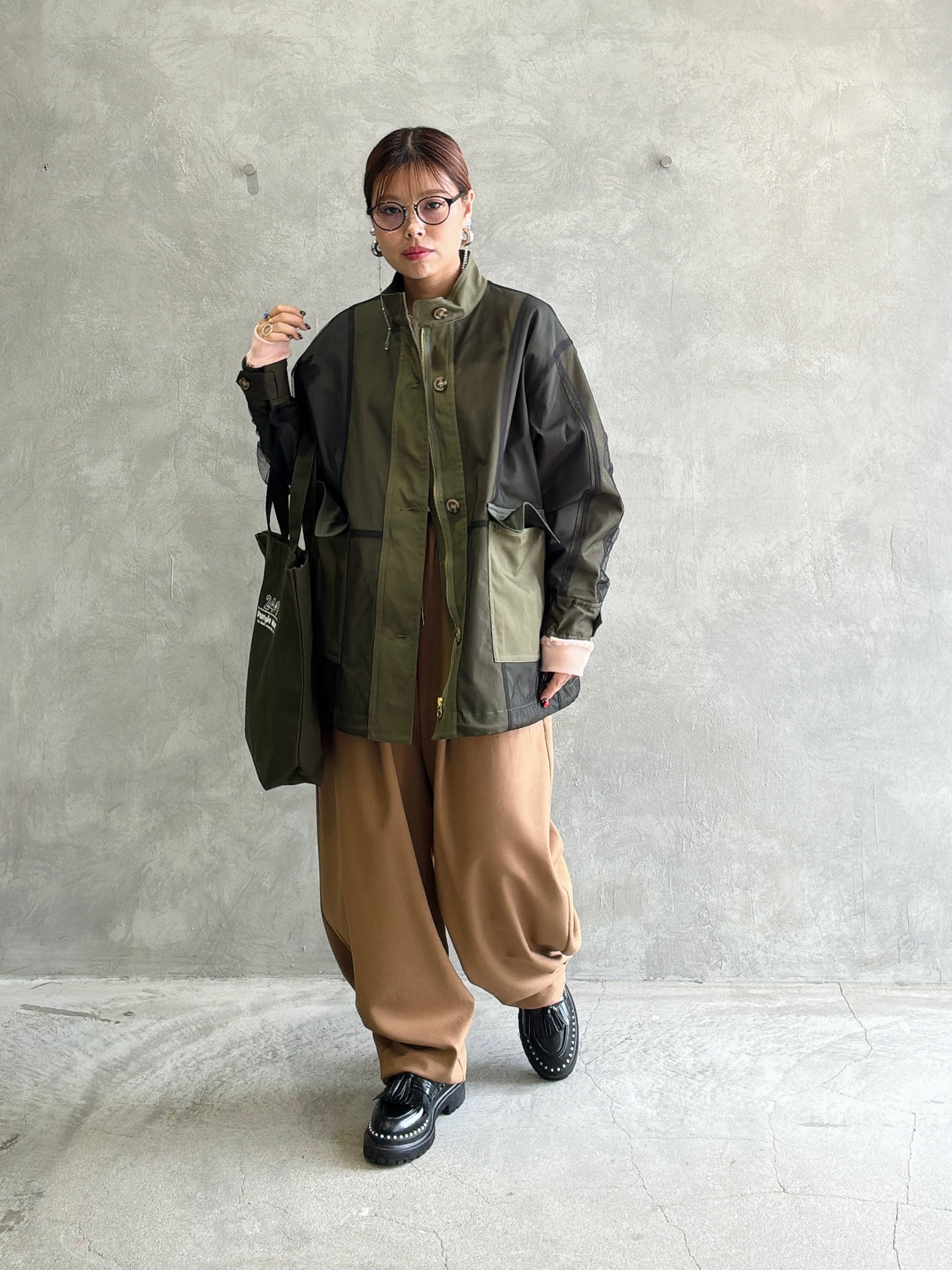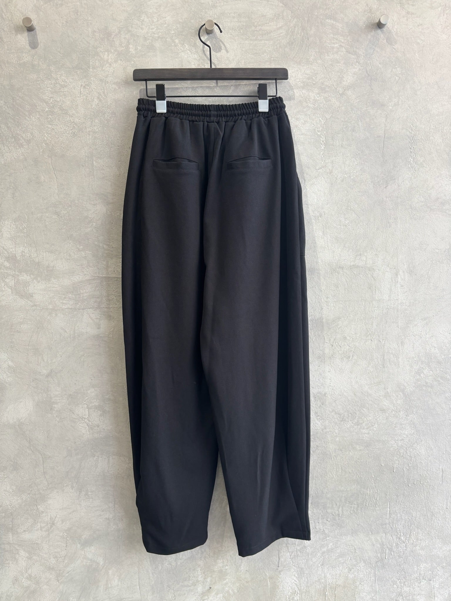 立体的なポケットと、ゆるいシルエットなのに綺麗みえするというシアンさんが大得意とするデザインの新作的なアイテムです。裾に大きく入ったタックがいい仕事してくれています。軽い履き心地でふんわりとしているのに、ウールライクな生地感が上品に見せてくれるパンツです。ヒールを合わせたら綺麗めに、ブーツやスニーカーでもペタンコパンプスでも靴によってもテイストが変わる楽しいアイテムだと思います。