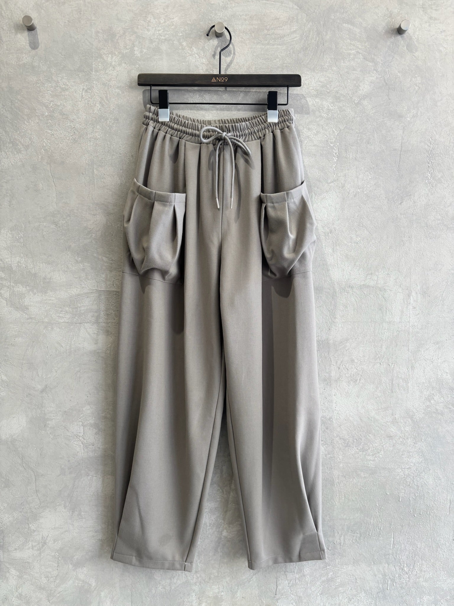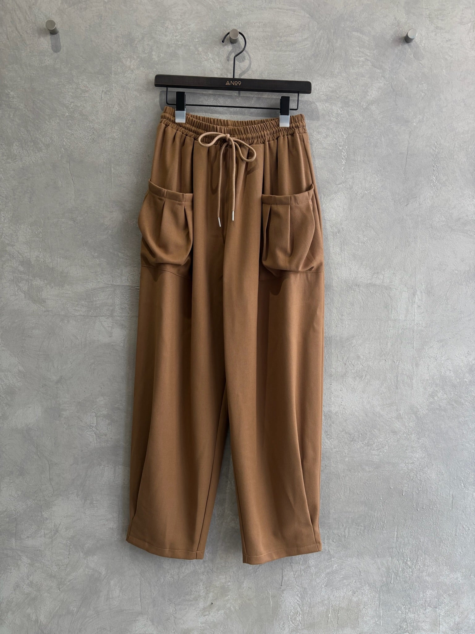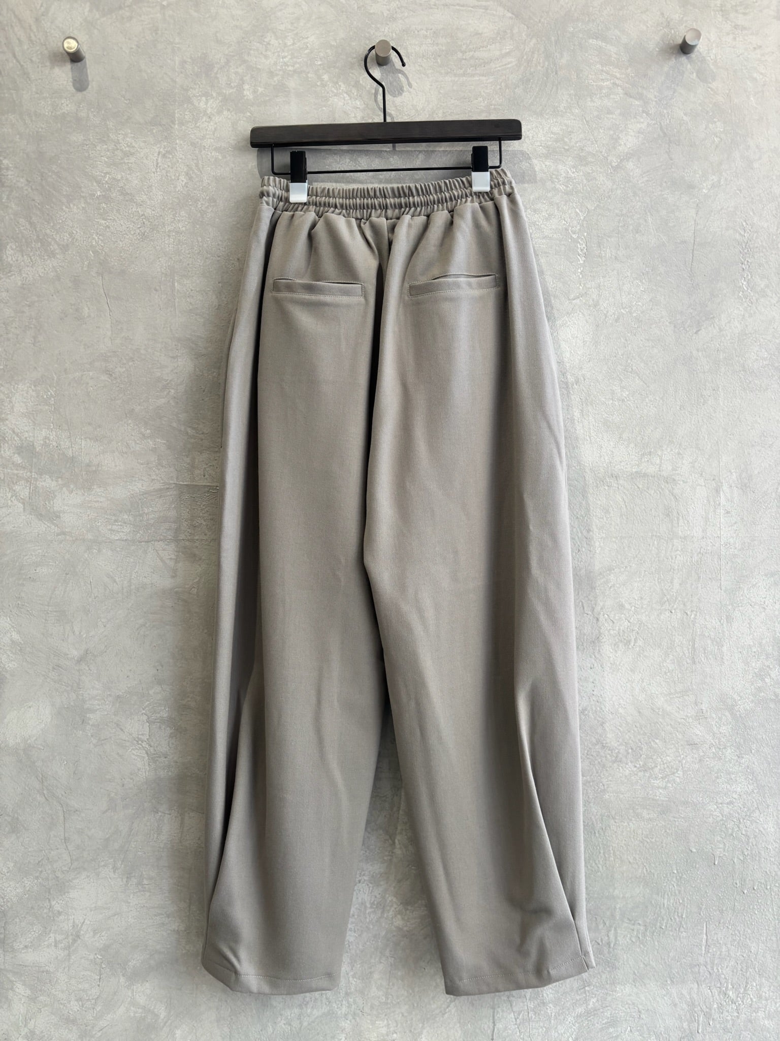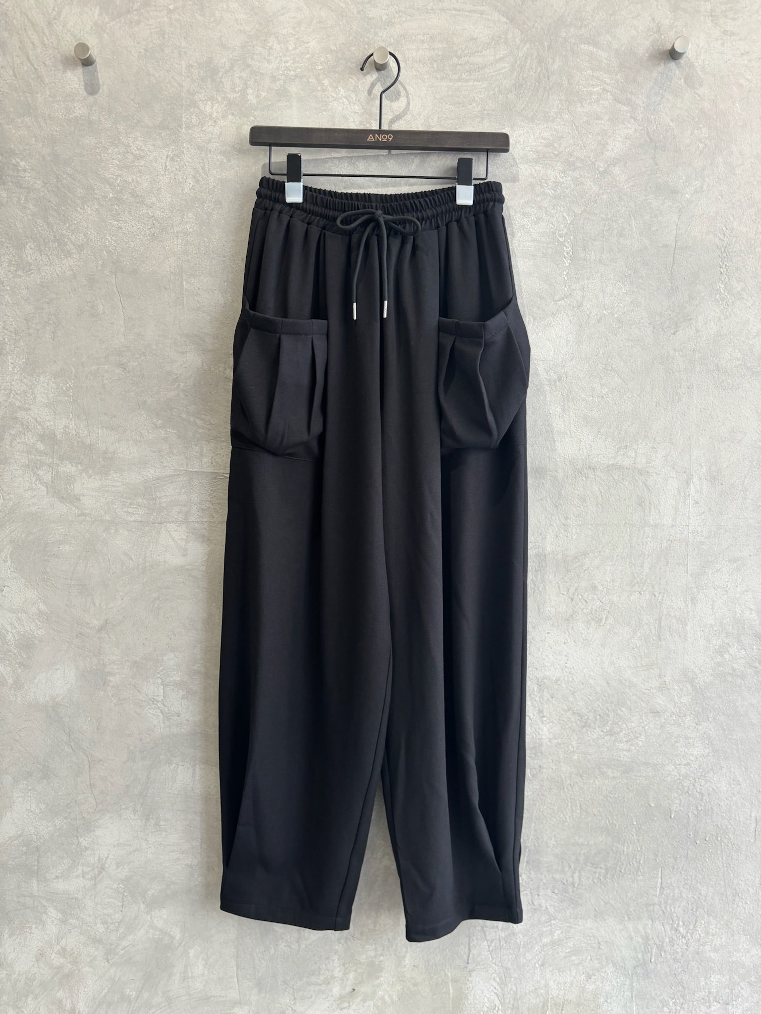 立体的なポケットと、ゆるいシルエットなのに綺麗みえするというシアンさんが大得意とするデザインの新作的なアイテムです。裾に大きく入ったタックがいい仕事してくれています。軽い履き心地でふんわりとしているのに、ウールライクな生地感が上品に見せてくれるパンツです。ヒールを合わせたら綺麗めに、ブーツやスニーカーでもペタンコパンプスでも靴によってもテイストが変わる楽しいアイテムだと思います。
