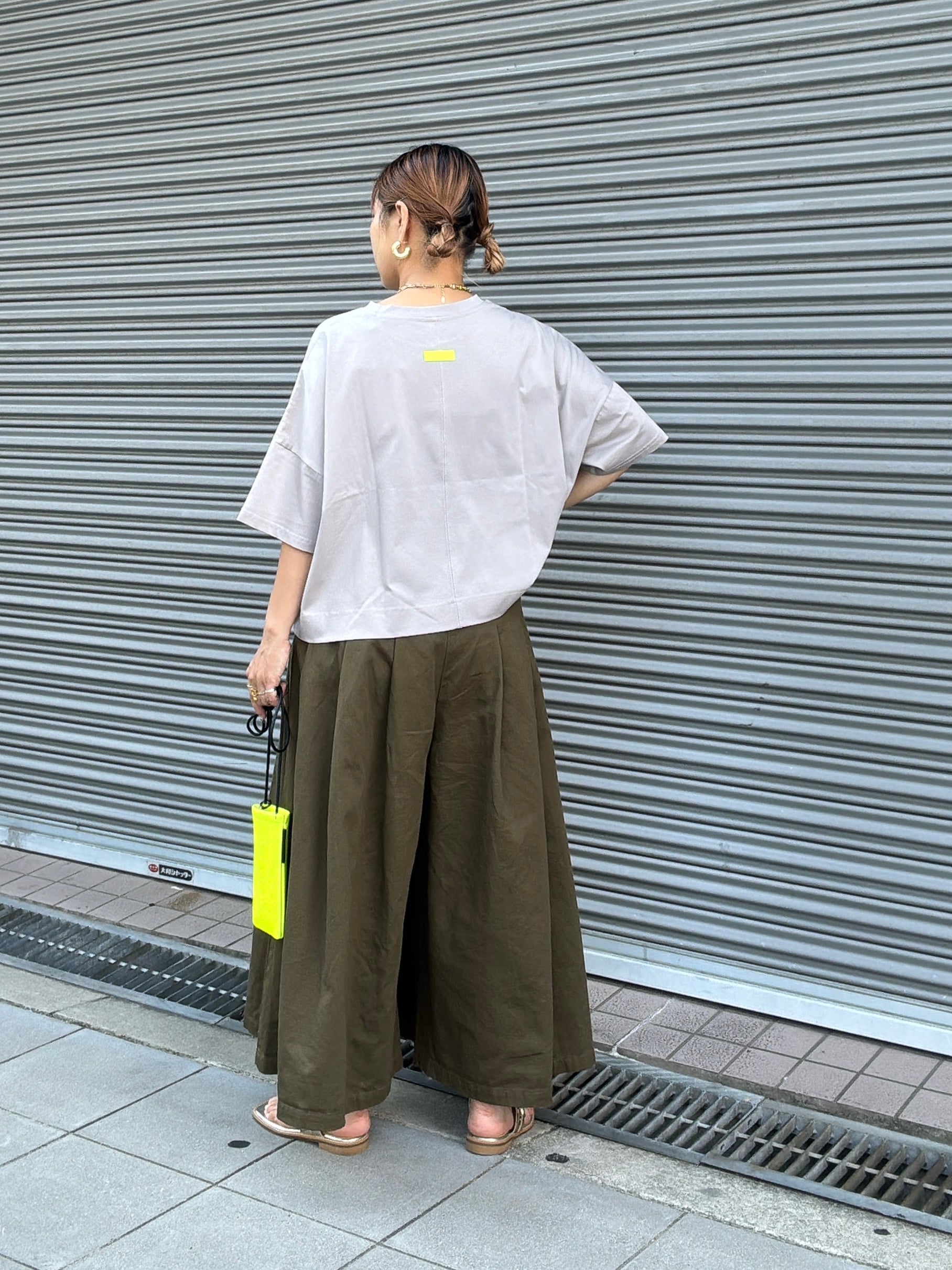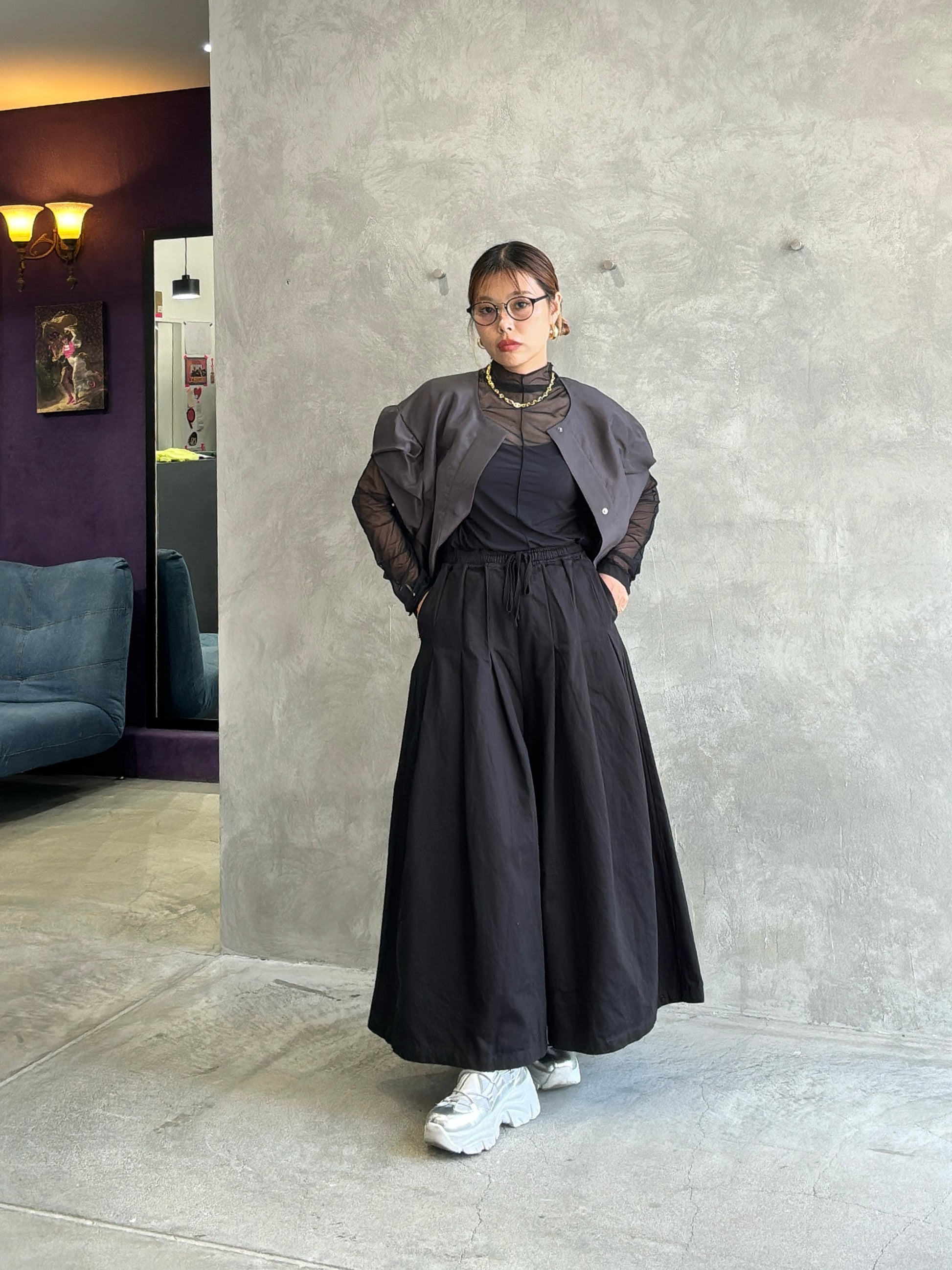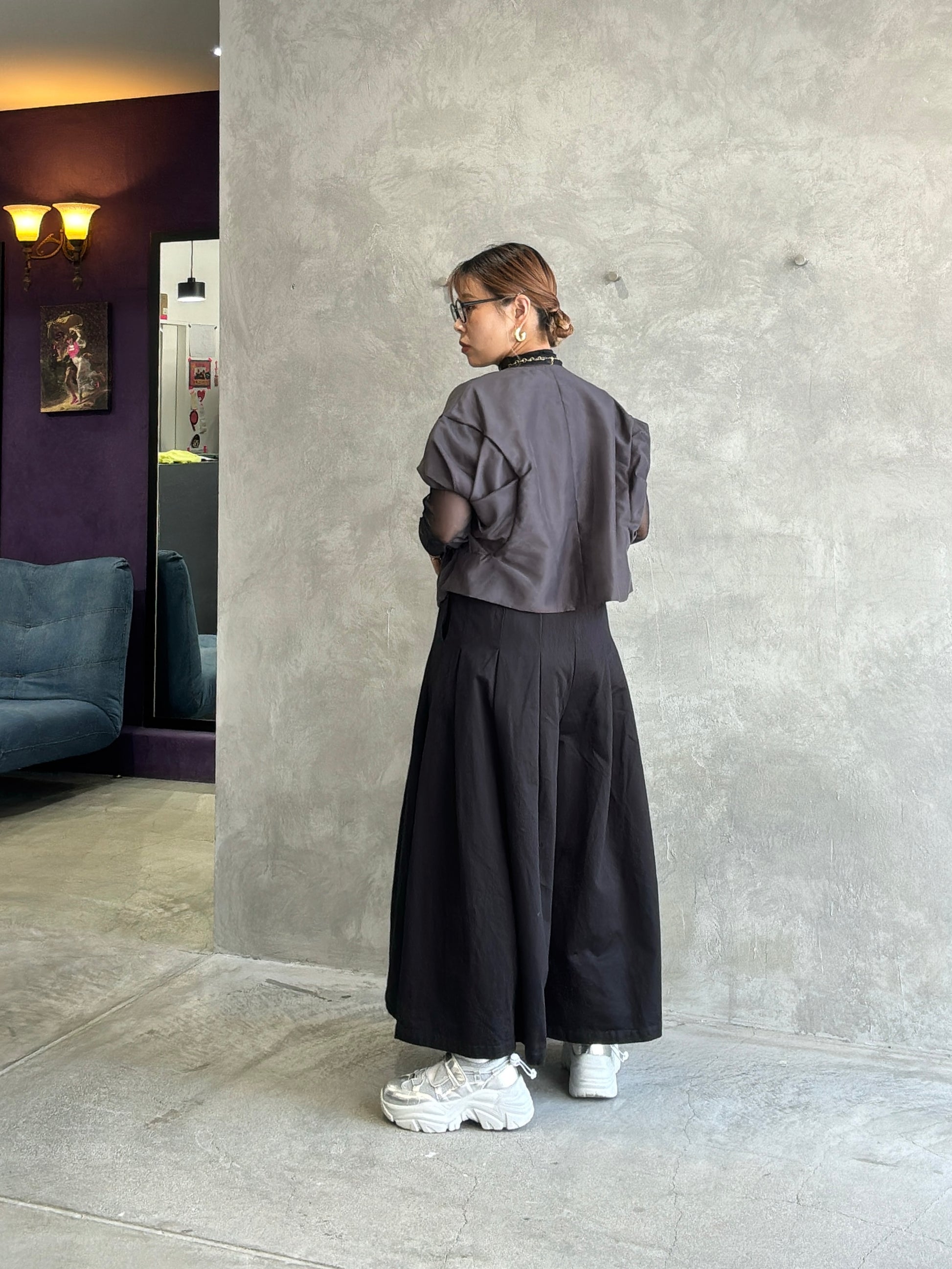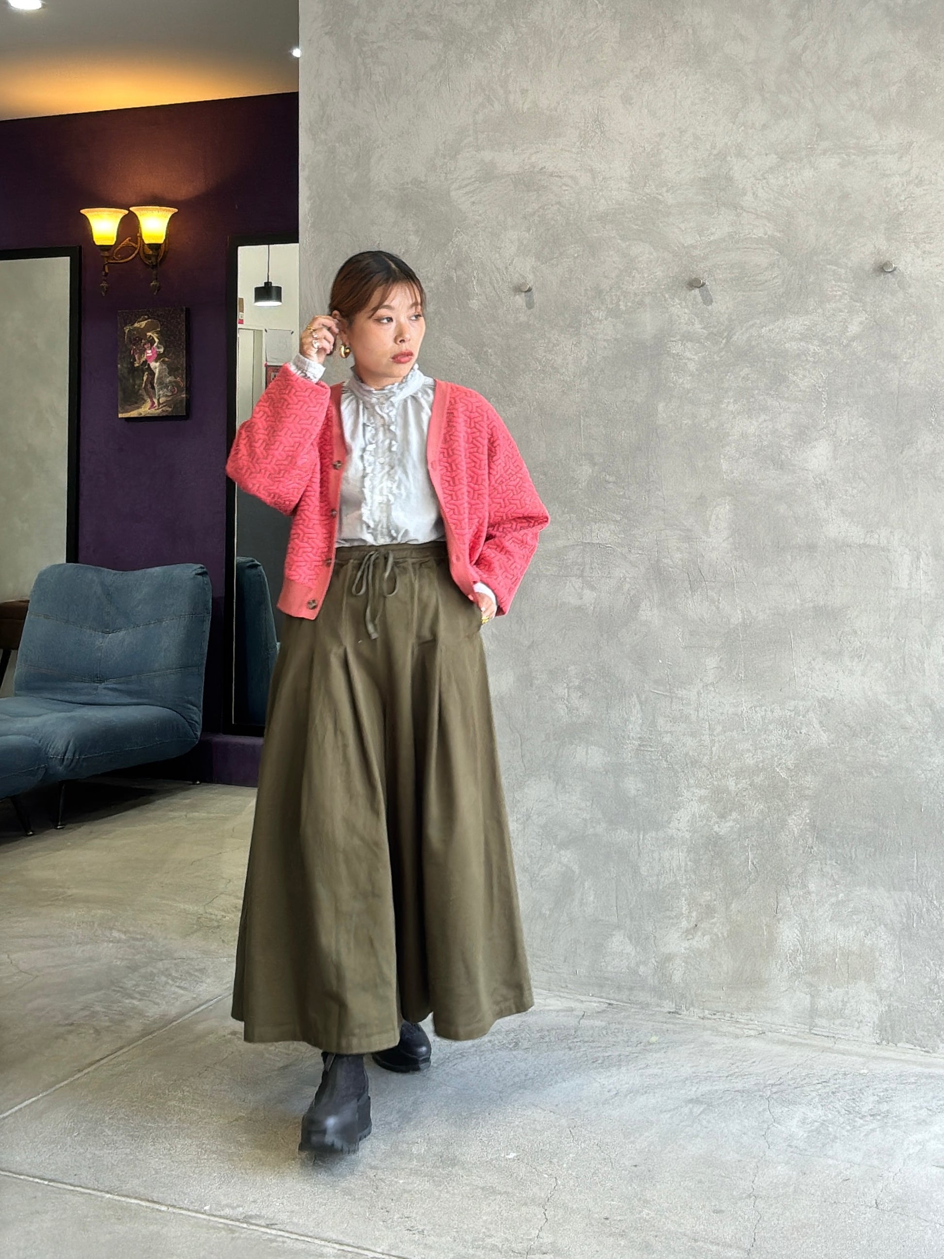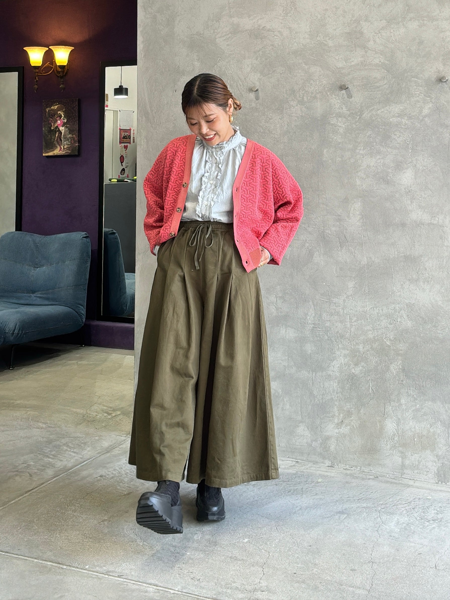 ヒラミも個人的にゲットしたお気に入りの一枚。厚手の生地で仕立てられていて、タックがしっかり入っているので、本当に袴みたいな雰囲気が出るのがポイント。レトロ感もありつつ、モードな存在感を放ってくれるアイテムです。