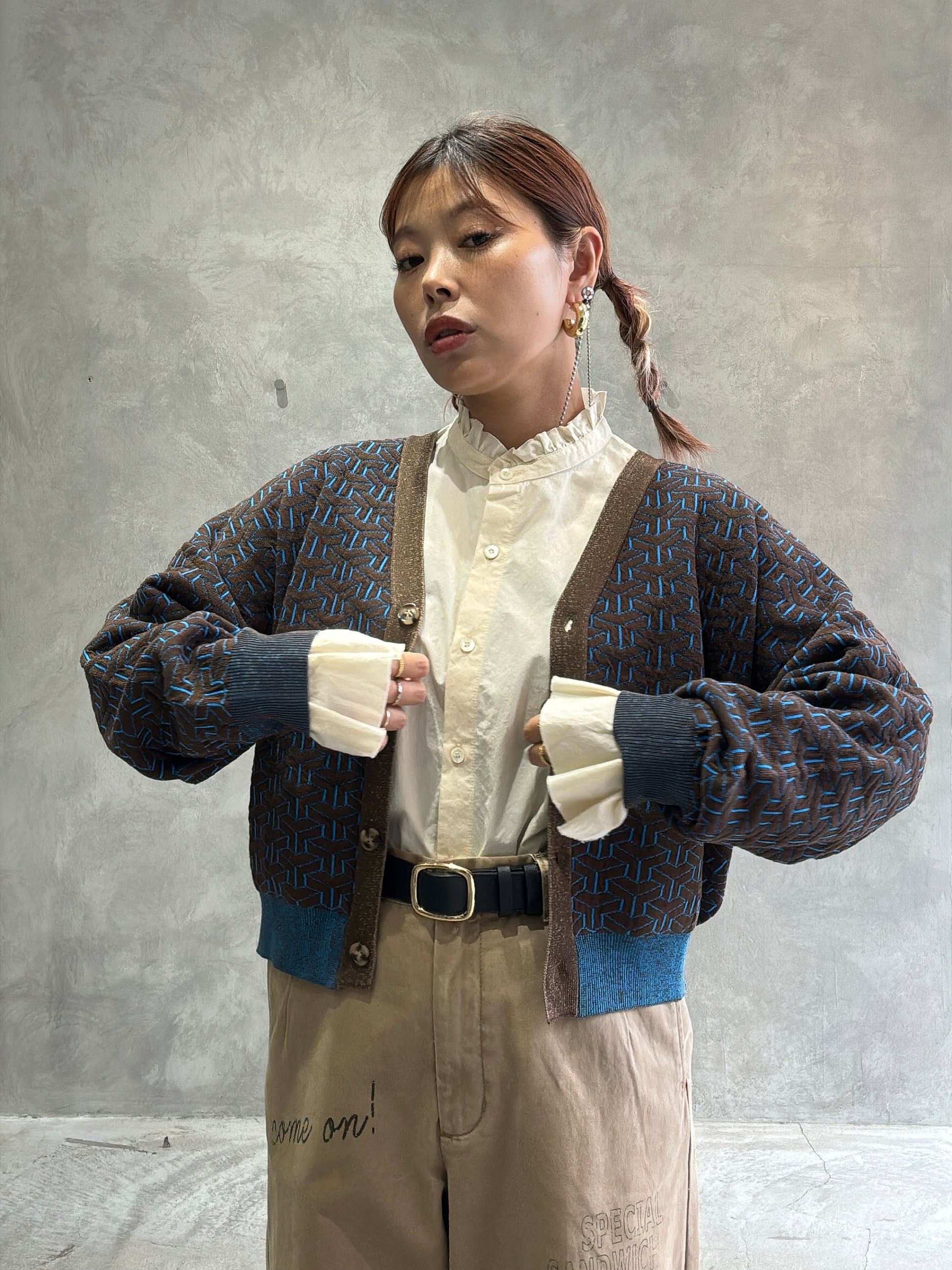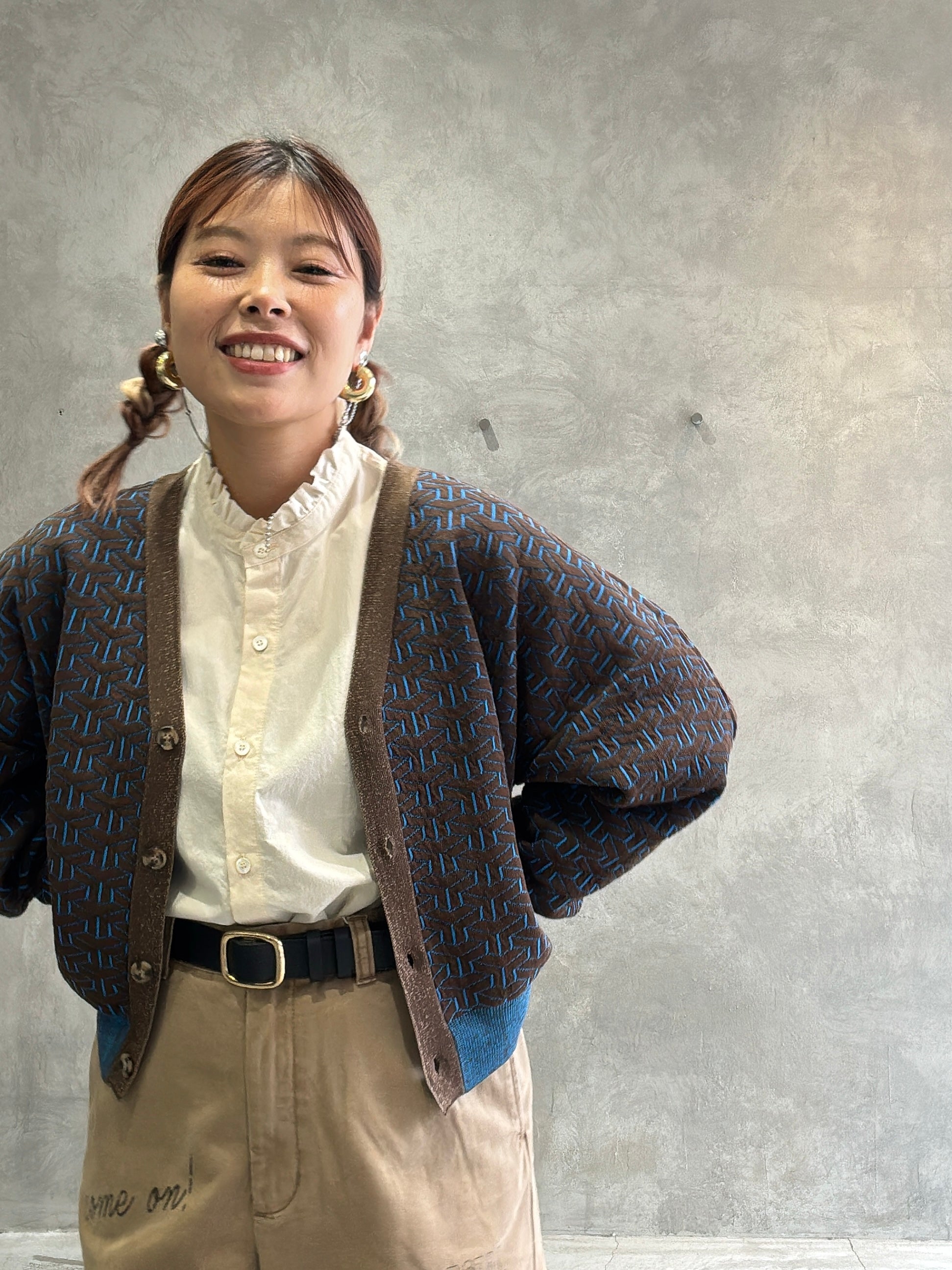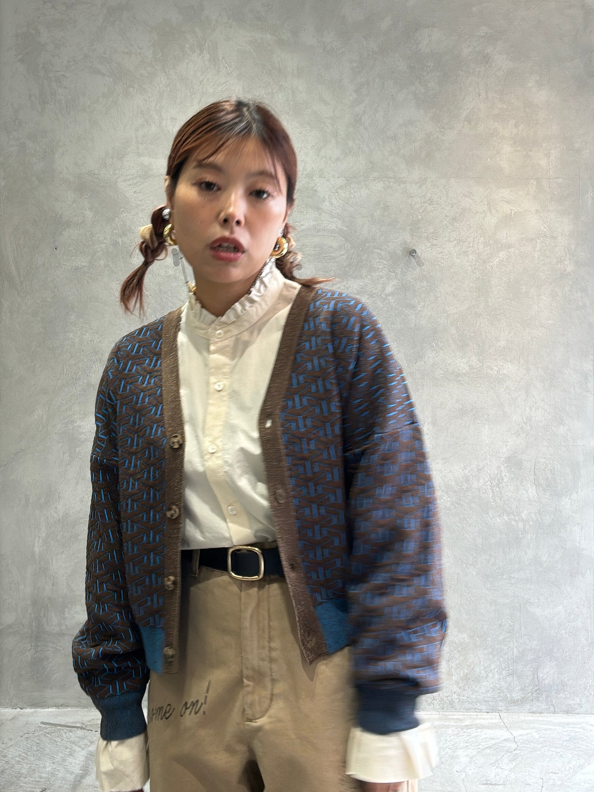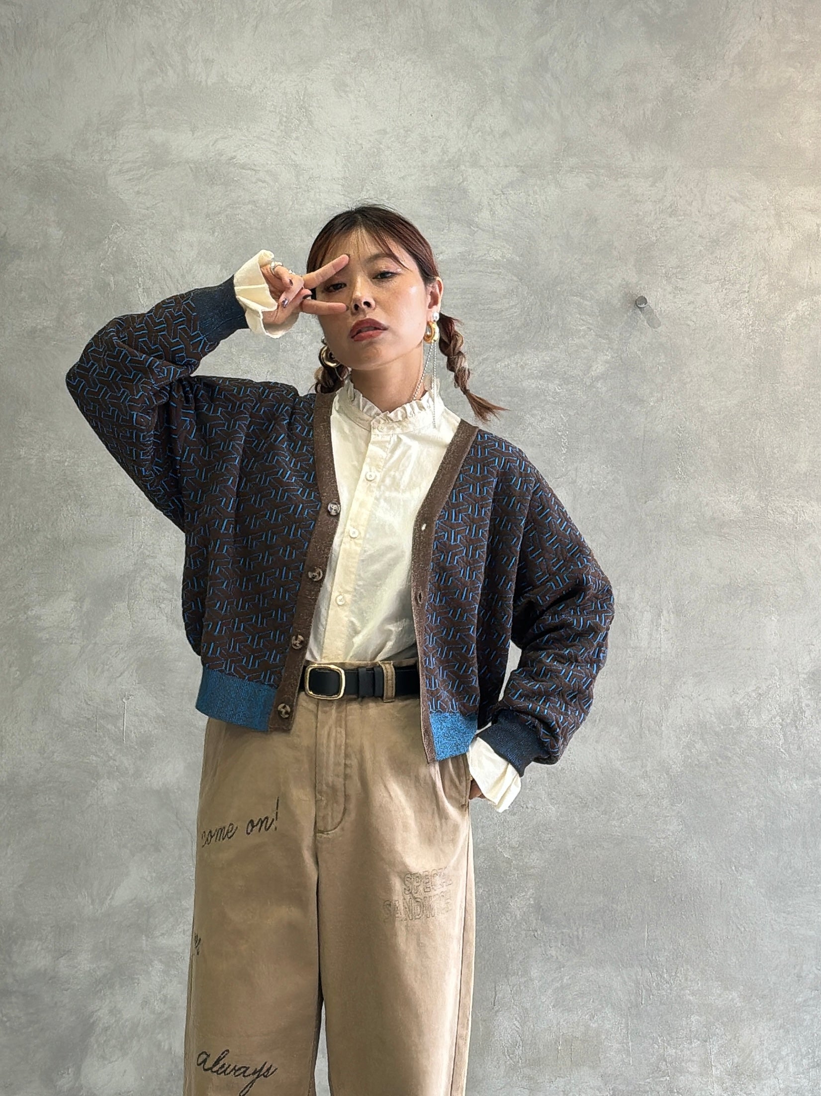 ニットですが、もっちりとした着心地でジャガードニットなのにめちゃくちゃ軽量。ビビッドな色使いの中にキラリとひかる系が入っていて、ジャガードの独特な立体感を引き立ててくれます。深いVネックのカーディガンなので前を閉めても、羽織としても優秀。2025年のトレンド感を意識して丈そんなに長くありませんが、マニッシュでレトロなLE MÉLANGEさんのコーデが捗ること間違いなし。お手持ちのシンプルなボトムスとの合わせも可愛いと思います。