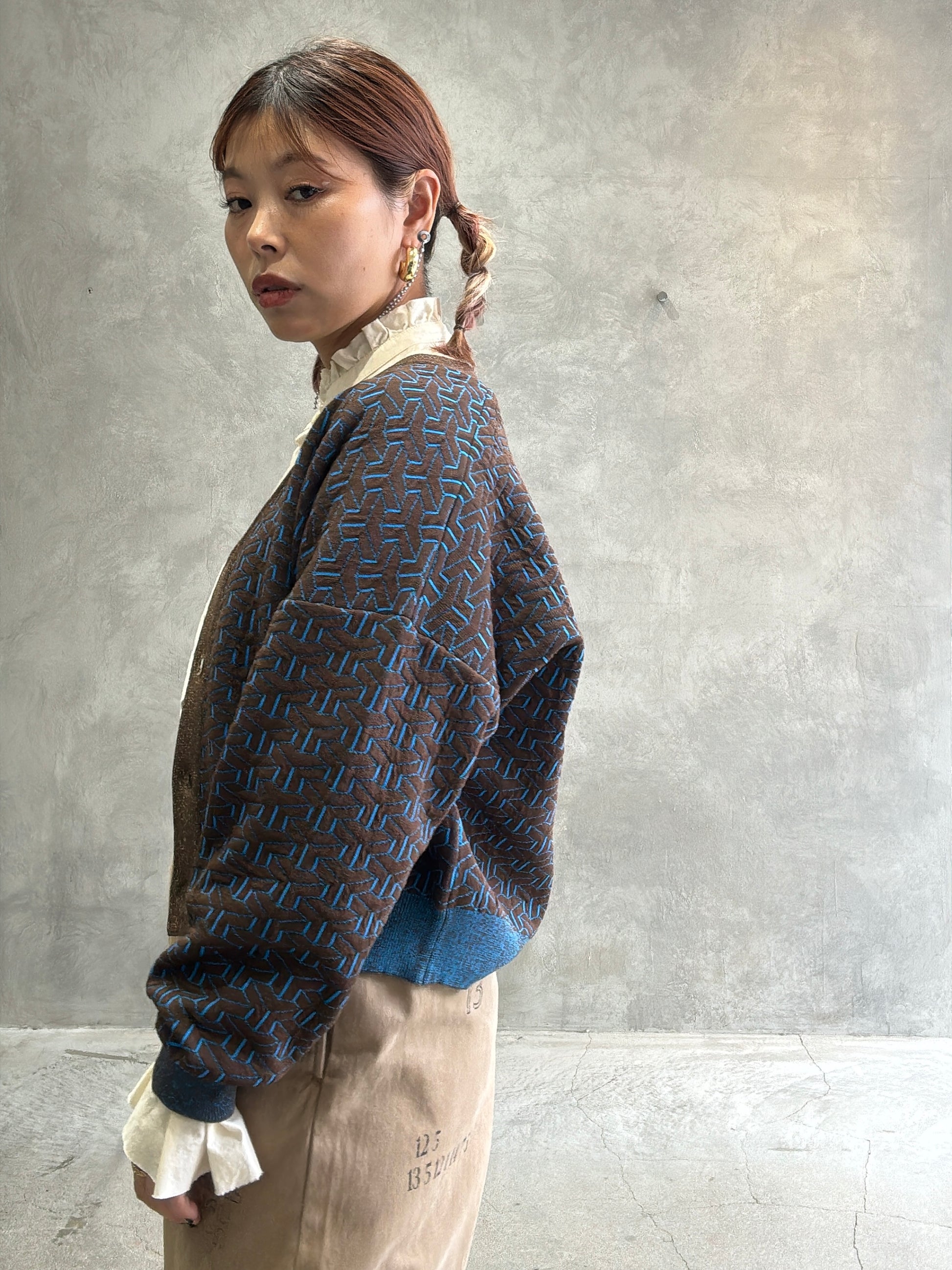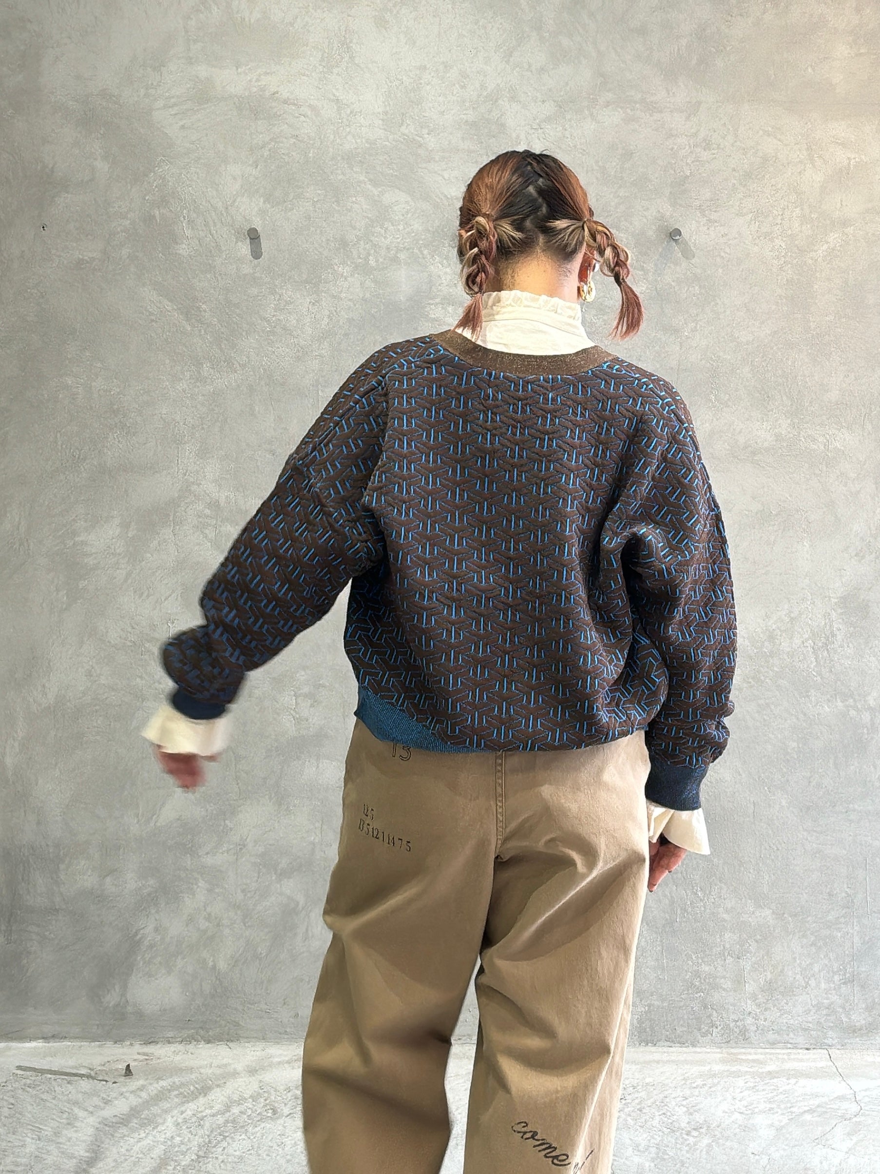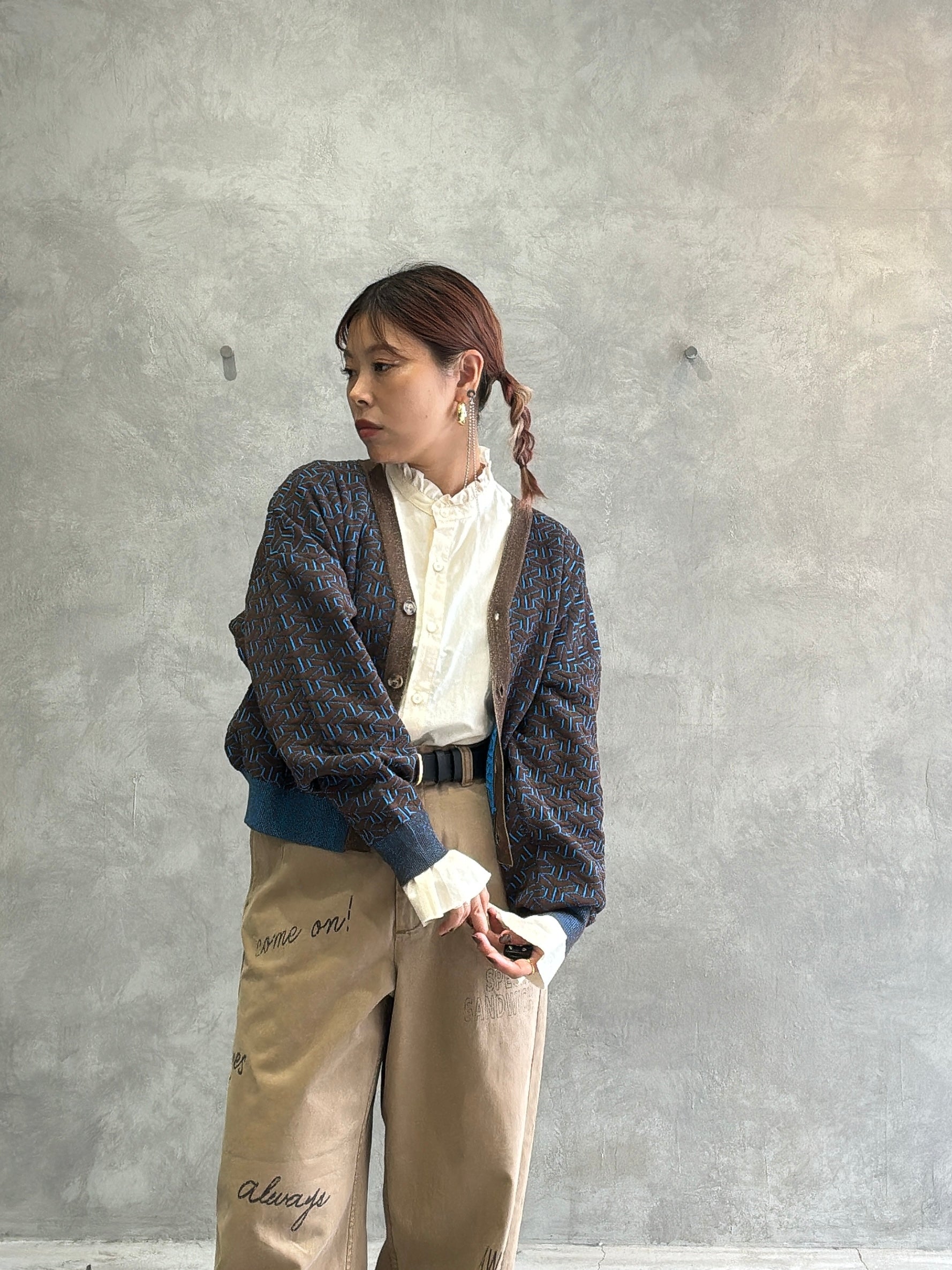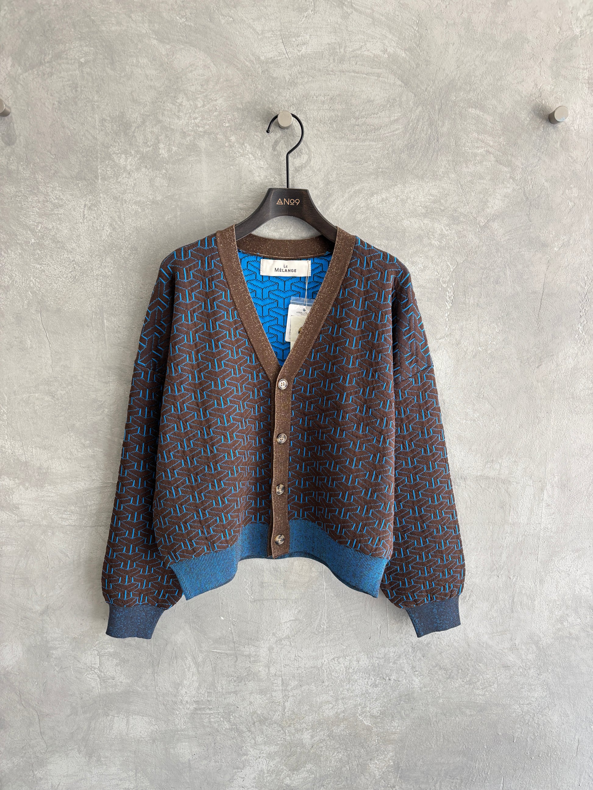 ニットですが、もっちりとした着心地でジャガードニットなのにめちゃくちゃ軽量。ビビッドな色使いの中にキラリとひかる系が入っていて、ジャガードの独特な立体感を引き立ててくれます。深いVネックのカーディガンなので前を閉めても、羽織としても優秀。2025年のトレンド感を意識して丈そんなに長くありませんが、マニッシュでレトロなLE MÉLANGEさんのコーデが捗ること間違いなし。お手持ちのシンプルなボトムスとの合わせも可愛いと思います。