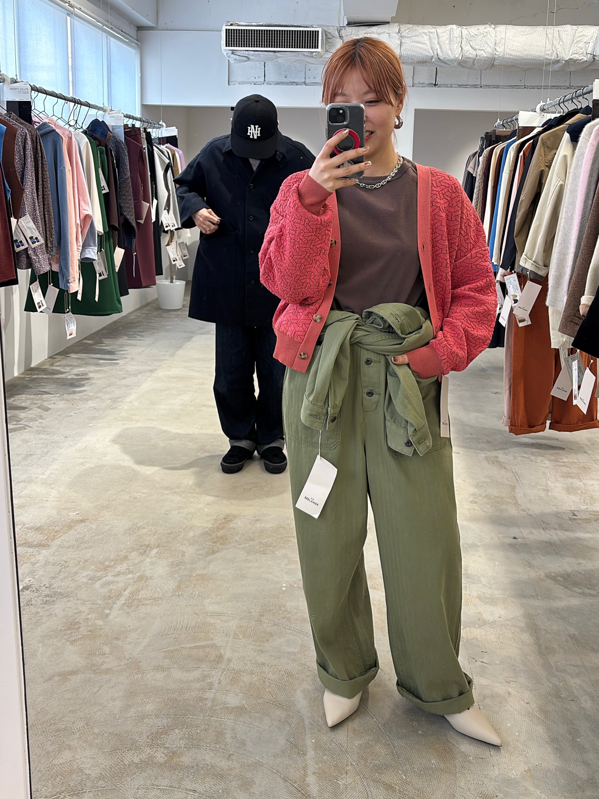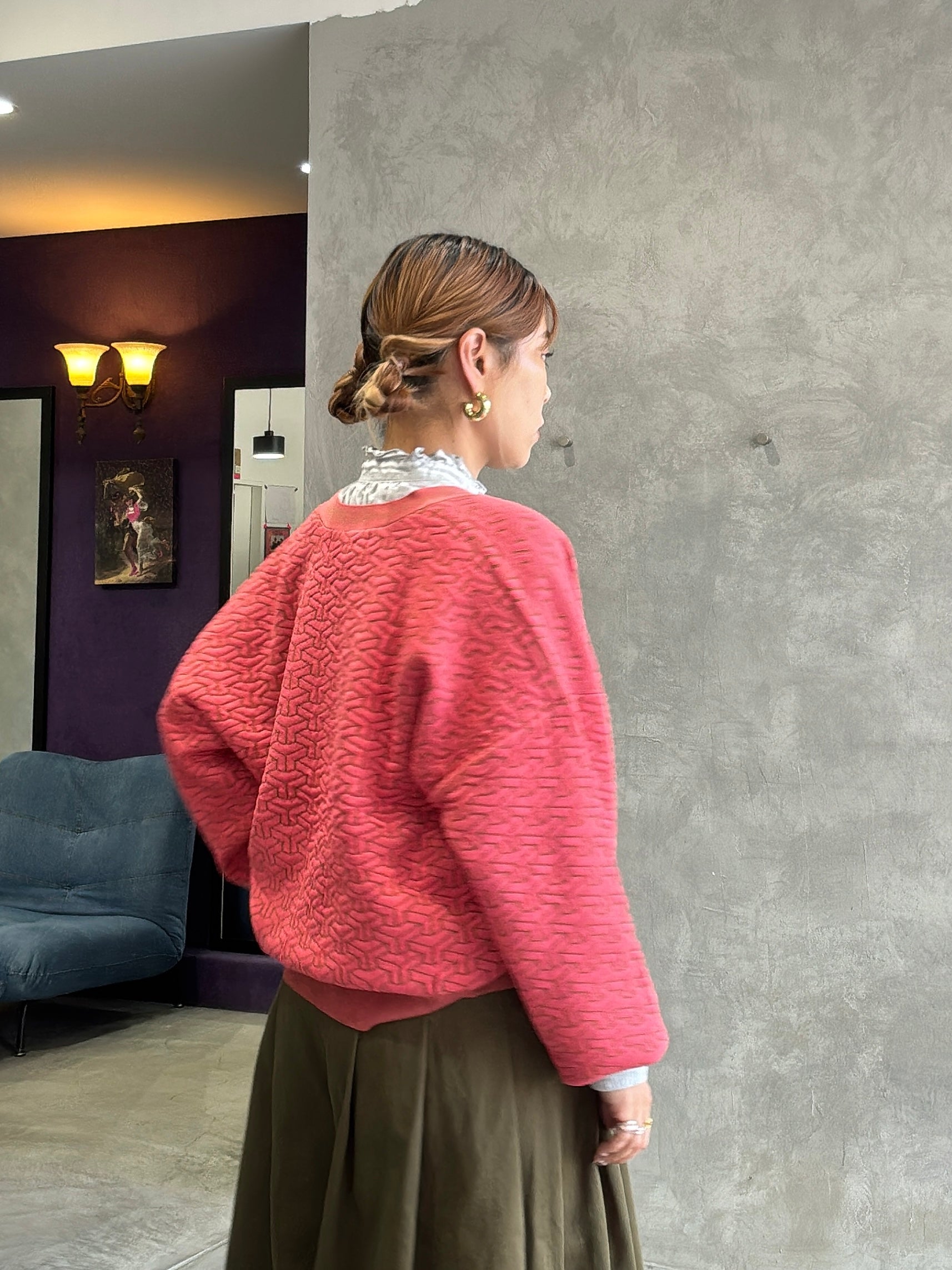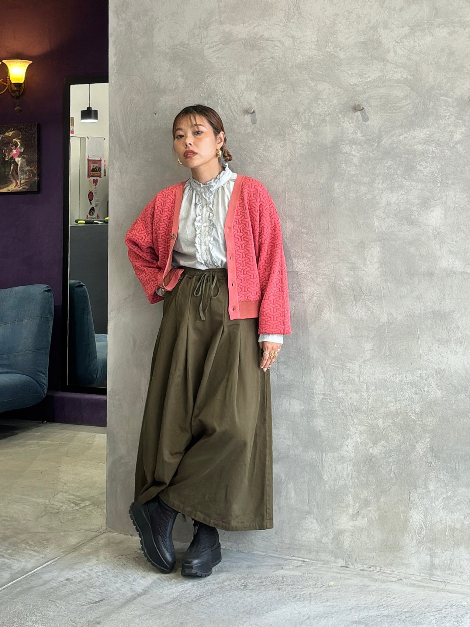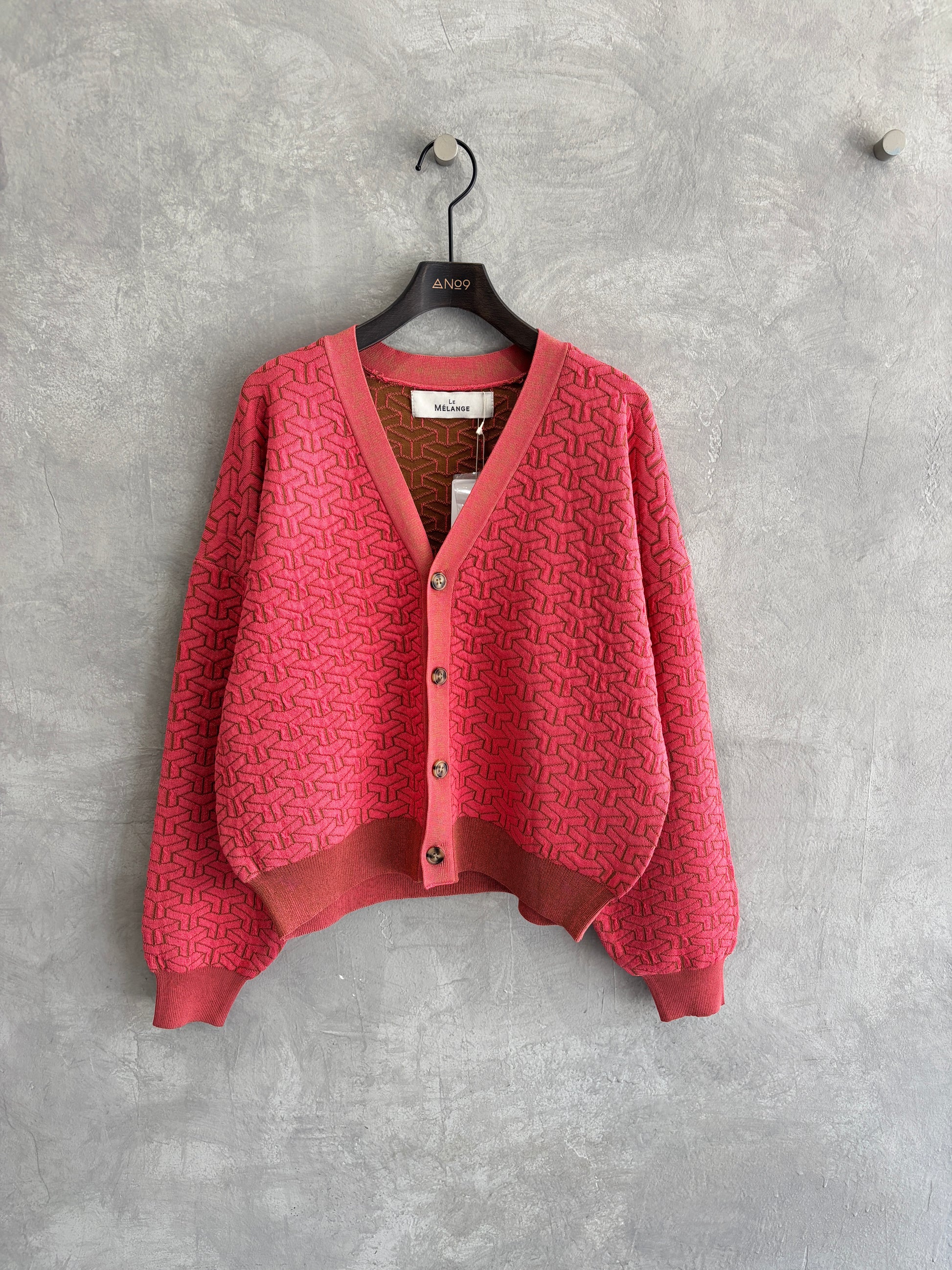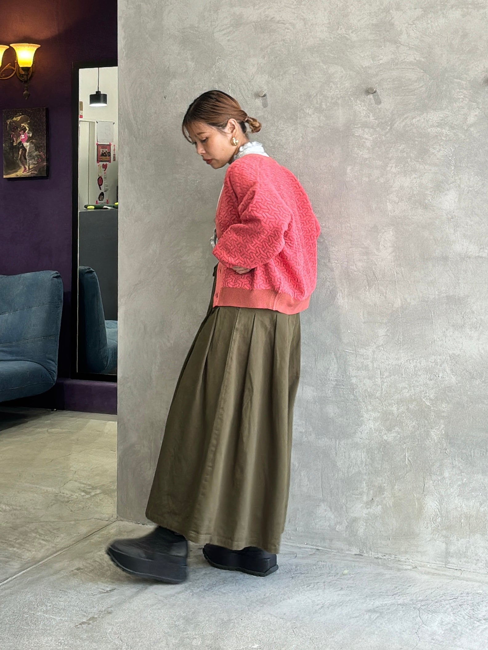 ニットですが、もっちりとした着心地でジャガードニットなのにめちゃくちゃ軽量。ビビッドな色使いの中にキラリとひかる系が入っていて、ジャガードの独特な立体感を引き立ててくれます。深いVネックのカーディガンなので前を閉めても、羽織としても優秀。2025年のトレンド感を意識して丈そんなに長くありませんが、マニッシュでレトロなLE MÉLANGEさんのコーデが捗ること間違いなし。お手持ちのシンプルなボトムスとの合わせも可愛いと思います。