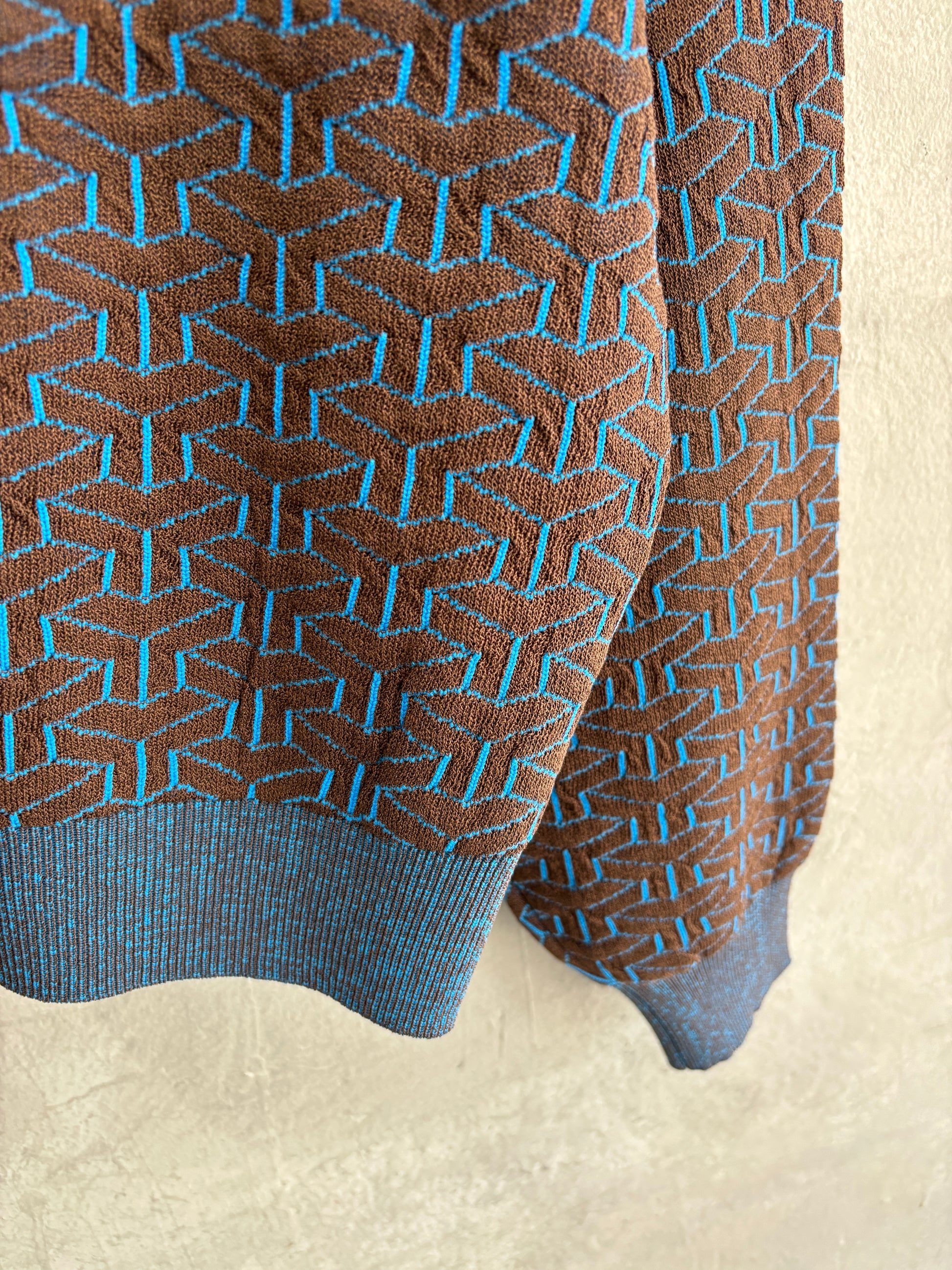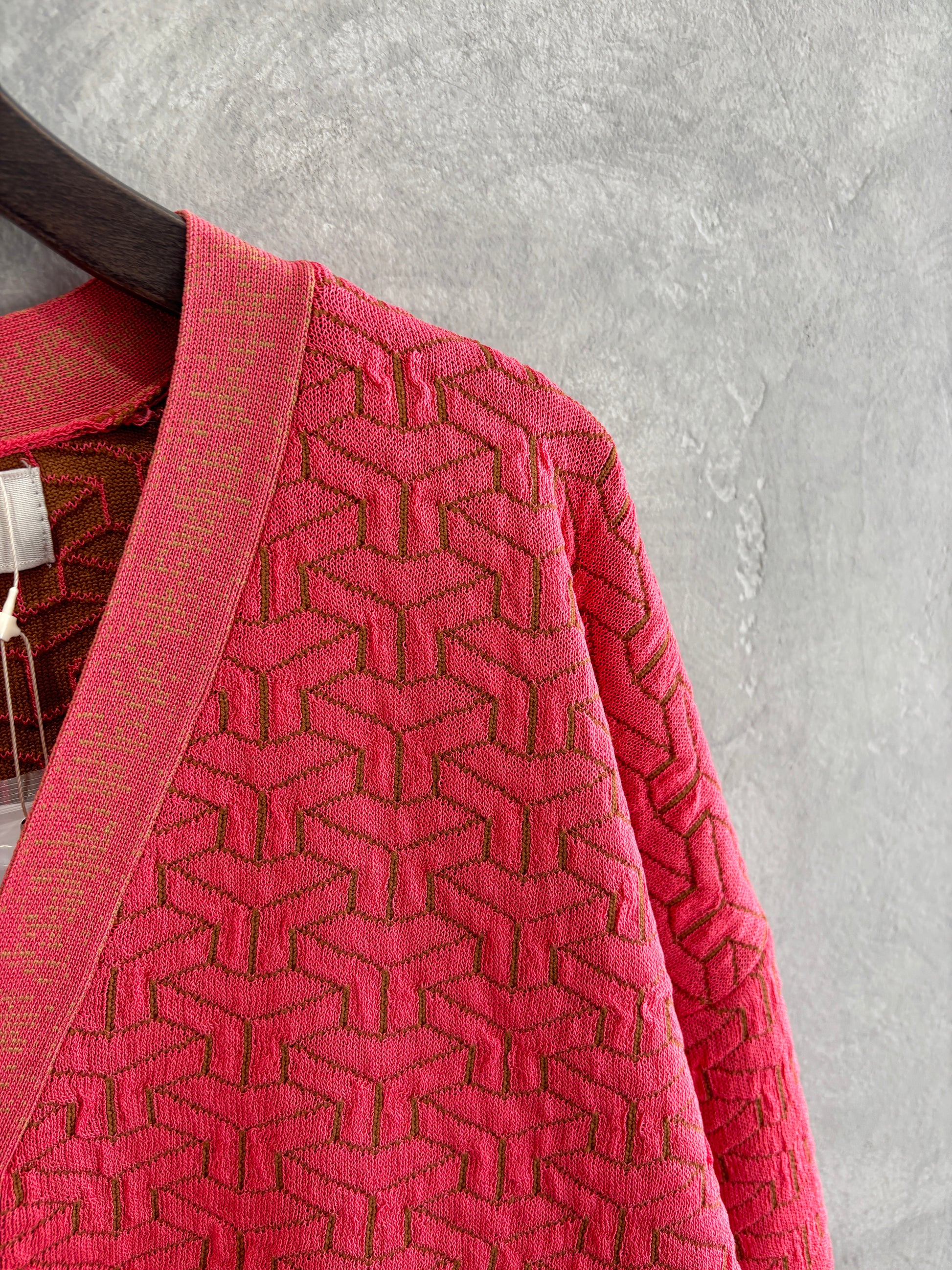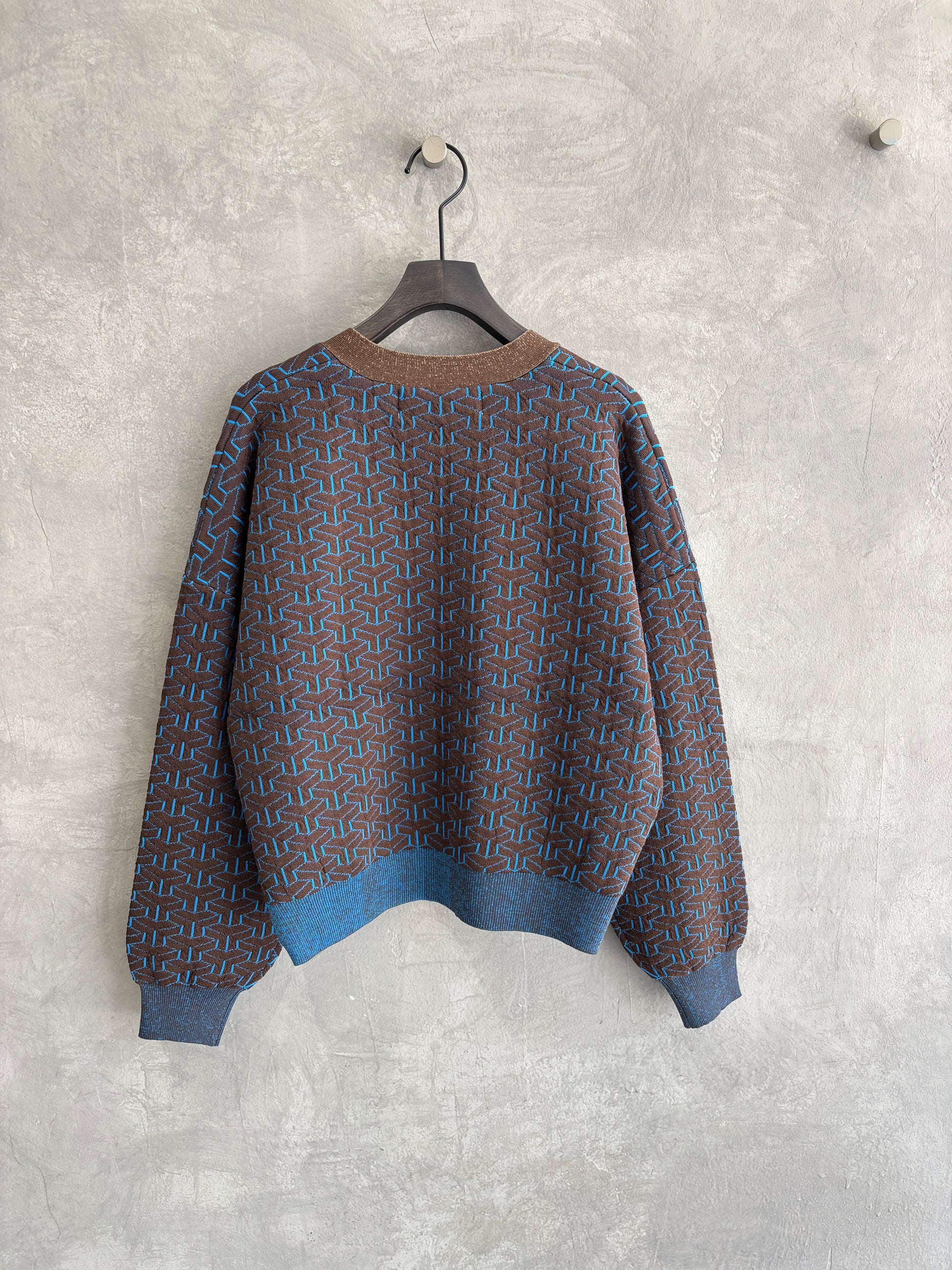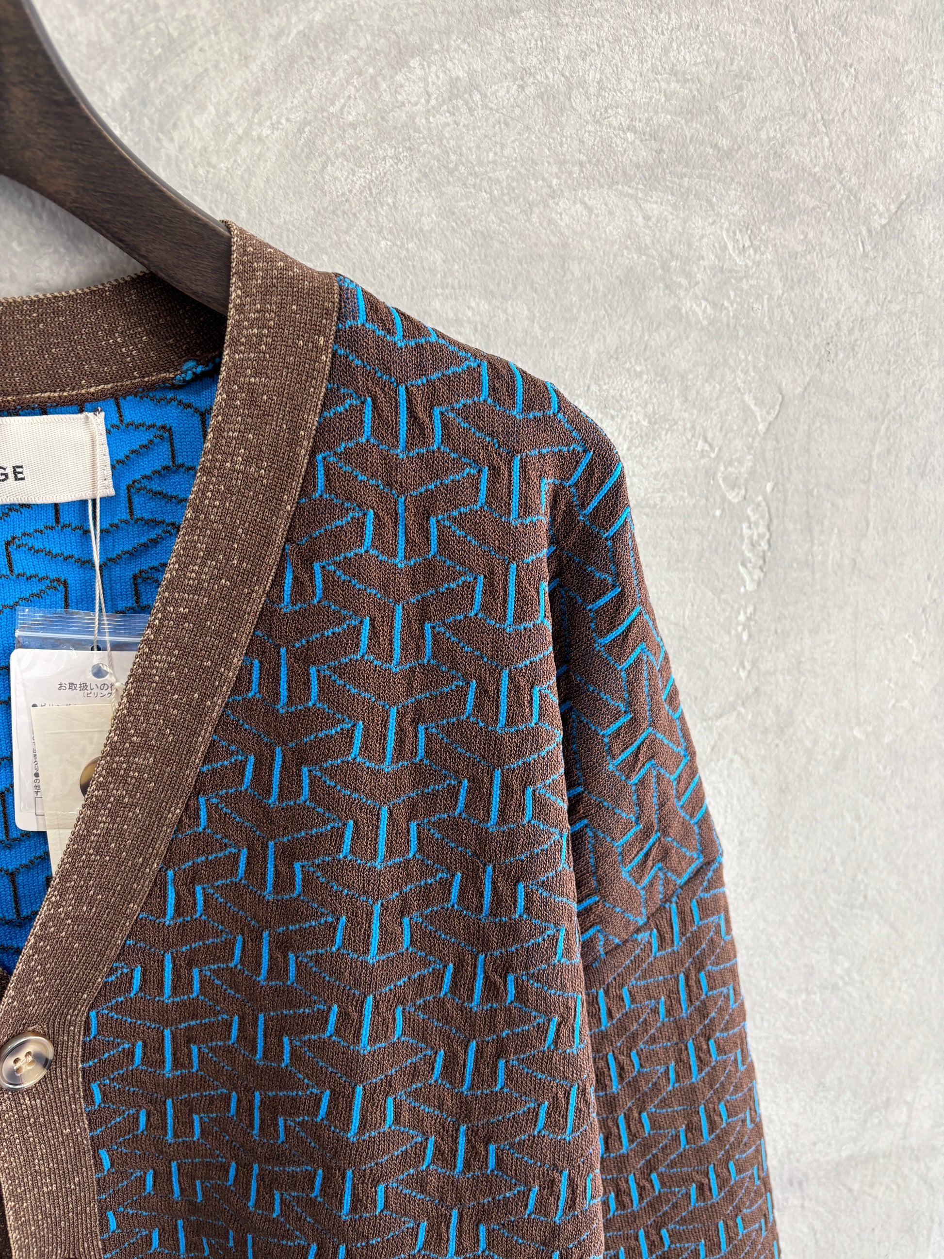 ニットですが、もっちりとした着心地でジャガードニットなのにめちゃくちゃ軽量。ビビッドな色使いの中にキラリとひかる系が入っていて、ジャガードの独特な立体感を引き立ててくれます。深いVネックのカーディガンなので前を閉めても、羽織としても優秀。2025年のトレンド感を意識して丈そんなに長くありませんが、マニッシュでレトロなLE MÉLANGEさんのコーデが捗ること間違いなし。お手持ちのシンプルなボトムスとの合わせも可愛いと思います。